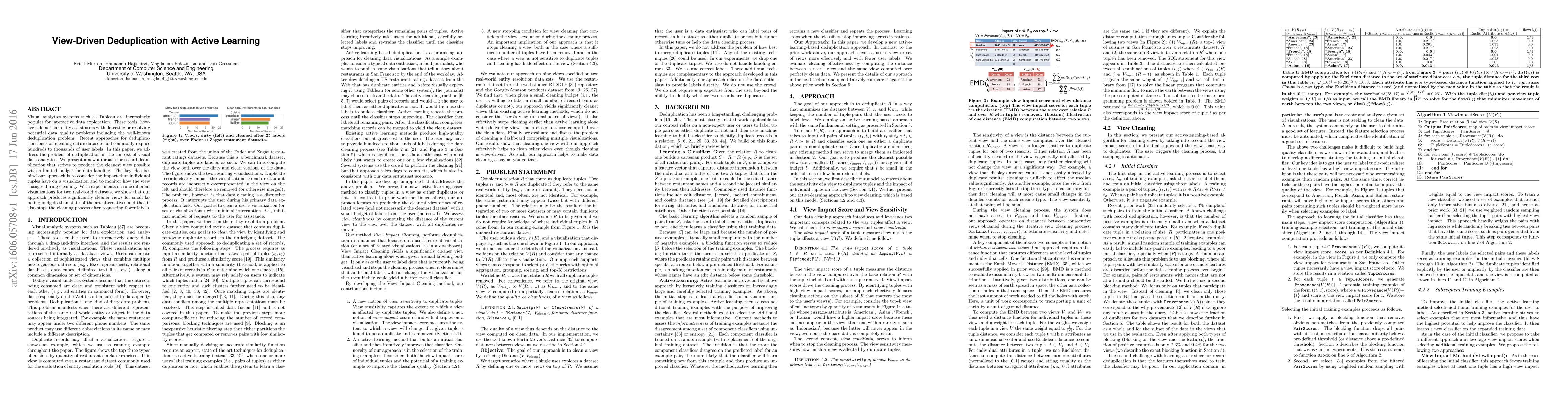 This paper introduces a view-driven deduplication method that leverages active learning to improve data quality in visual analytics systems like Tableau. The proposed approach prioritizes the impact of individual records on visualizations, requesting fewer labels to achieve cleaner views compared to existing methods.