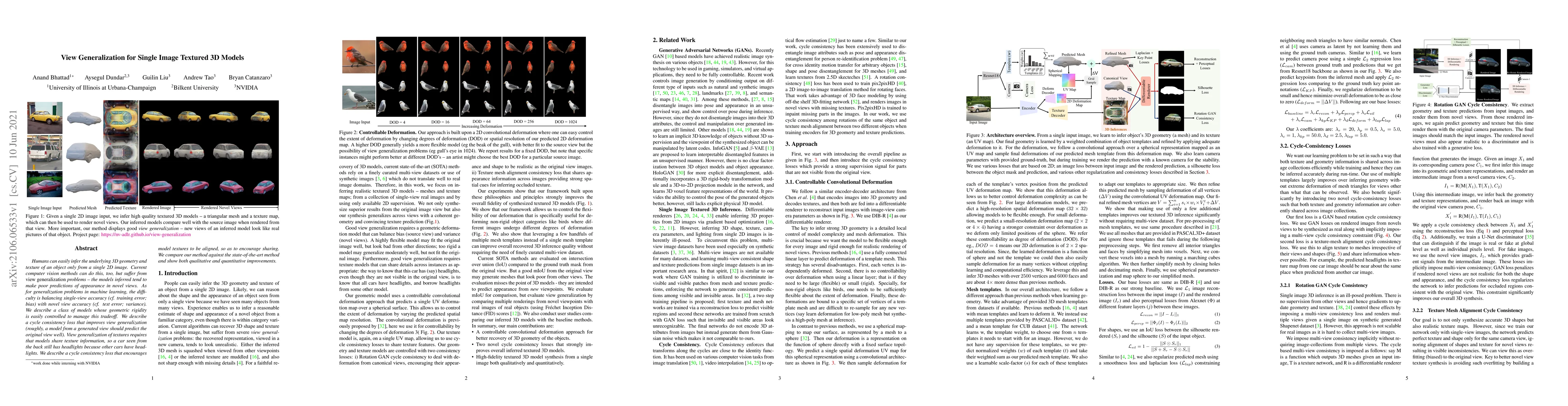 Humans can easily infer the underlying 3D geometry and texture of an object only from a single 2D image. Current computer vision methods can do this, too, but suffer from view generalization problems - the models inferred tend to make poor predictions of appearance in novel views. As for generalization problems in machine learning, the difficulty is balancing single-view accuracy (cf. training error; bias) with novel view accuracy (cf. test error; variance). We describe a class of models whose geometric rigidity is easily controlled to manage this tradeoff. We describe a cycle consistency loss that improves view generalization (roughly, a model from a generated view should predict the original view well). View generalization of textures requires that models share texture information, so a car seen from the back still has headlights because other cars have headlights. We describe a cycle consistency loss that encourages model textures to be aligned, so as to encourage sharing. We compare our method against the state-of-the-art method and show both qualitative and quantitative improvements.