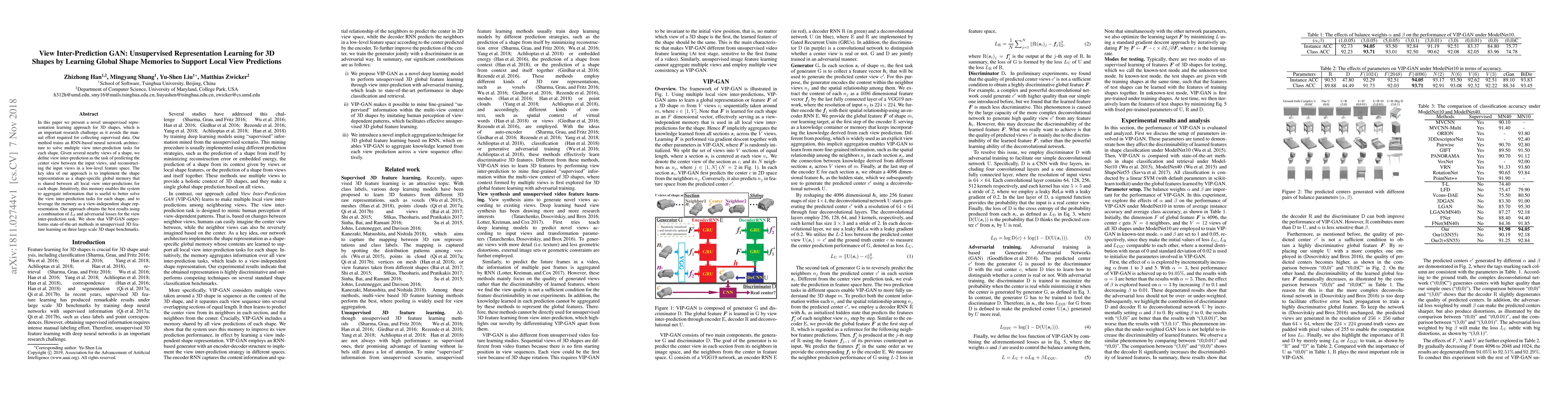 This paper introduces an unsupervised RNN-based GAN for learning 3D shape representations through view inter-prediction tasks, leveraging a global memory to aggregate shape-specific information for improved local view predictions. VIP-GAN outperforms existing methods on large-scale 3D shape benchmarks.