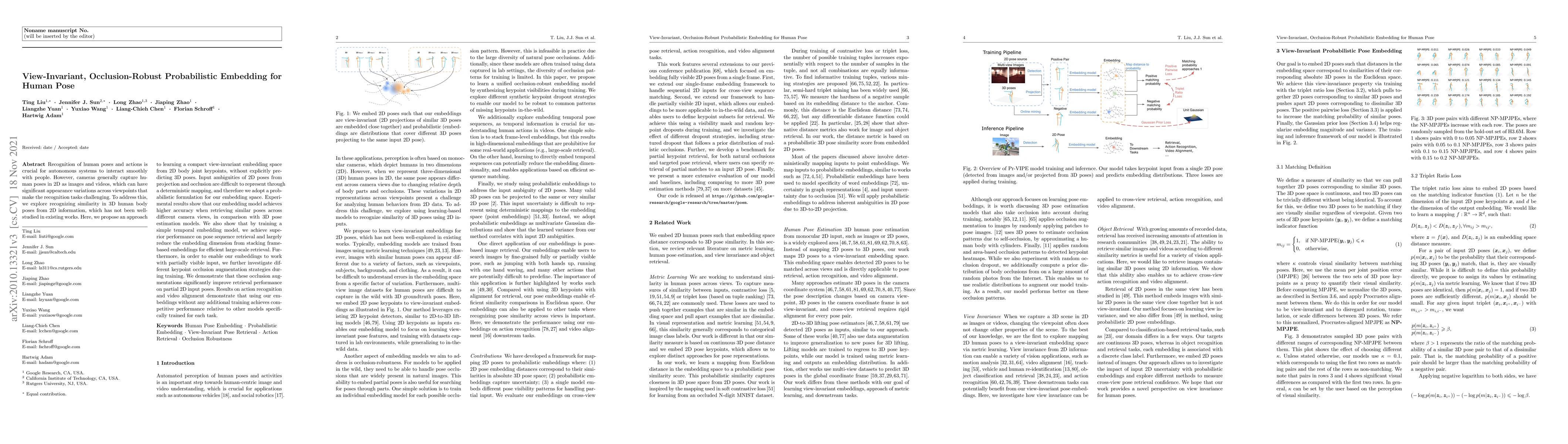 This paper proposes a probabilistic embedding model for view-invariant and occlusion-robust human pose recognition from 2D keypoints, achieving higher accuracy in pose retrieval across different camera views compared to 3D pose estimation models. The approach also demonstrates effective performance on pose sequence retrieval and action recognition using the embeddings without additional task-specific training.