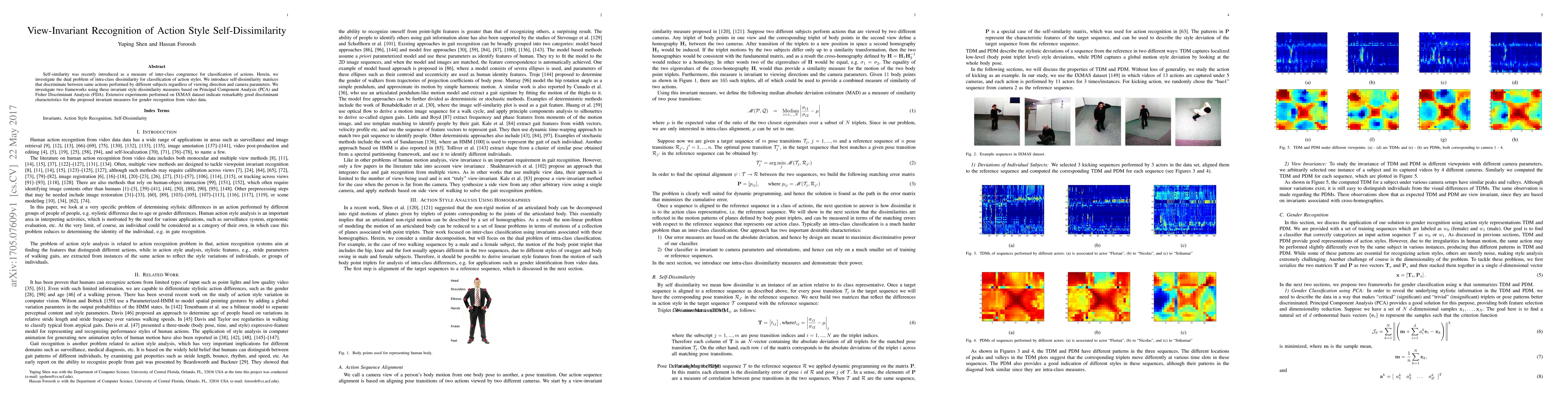Self-similarity was recently introduced as a measure of inter-class congruence for classification of actions. Herein, we investigate the dual problem of intra-class dissimilarity for classification of action styles. We introduce self-dissimilarity matrices that discriminate between same actions performed by different subjects regardless of viewing direction and camera parameters. We investigate two frameworks using these invariant style dissimilarity measures based on Principal Component Analysis (PCA) and Fisher Discriminant Analysis (FDA). Extensive experiments performed on IXMAS dataset indicate remarkably good discriminant characteristics for the proposed invariant measures for gender recognition from video data.