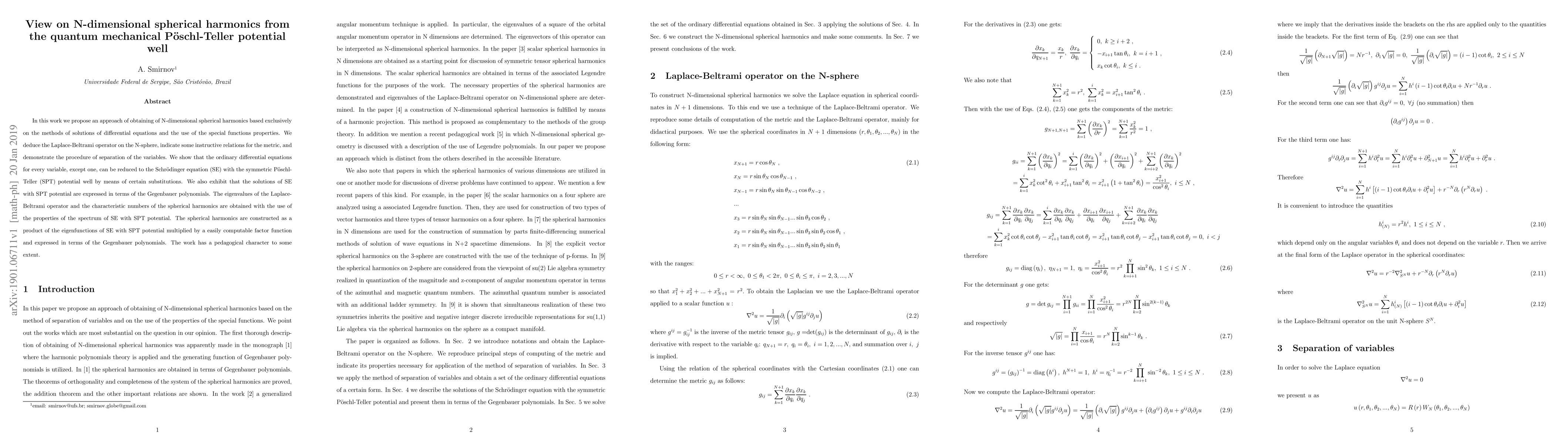 This paper presents a method for deriving N-dimensional spherical harmonics using differential equations and special functions, showing that the Laplace-Beltrami operator on the N-sphere can be separated into equations reducible to the Schrödinger equation with a symmetric Pöschl-Teller potential, whose solutions are expressed in terms of Gegenbauer polynomials. The spherical harmonics are constructed from these eigenfunctions.