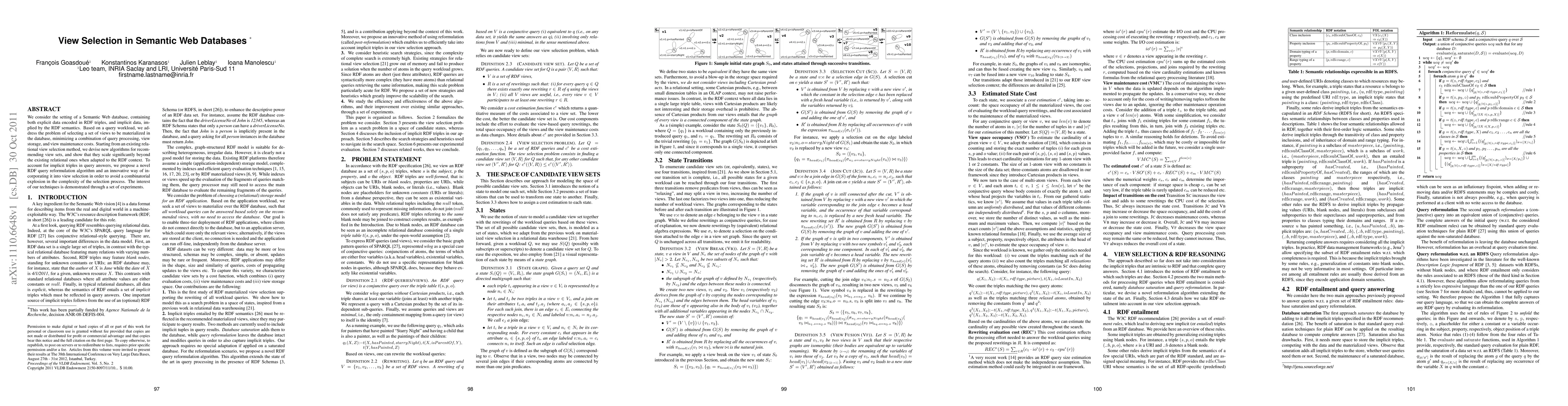 This paper proposes new algorithms for selecting optimal materialized views in Semantic Web databases to minimize costs related to query processing, view storage, and maintenance. It introduces an RDF query reformulation method to handle implicit data and demonstrates significant scalability improvements over existing relational view selection methods.