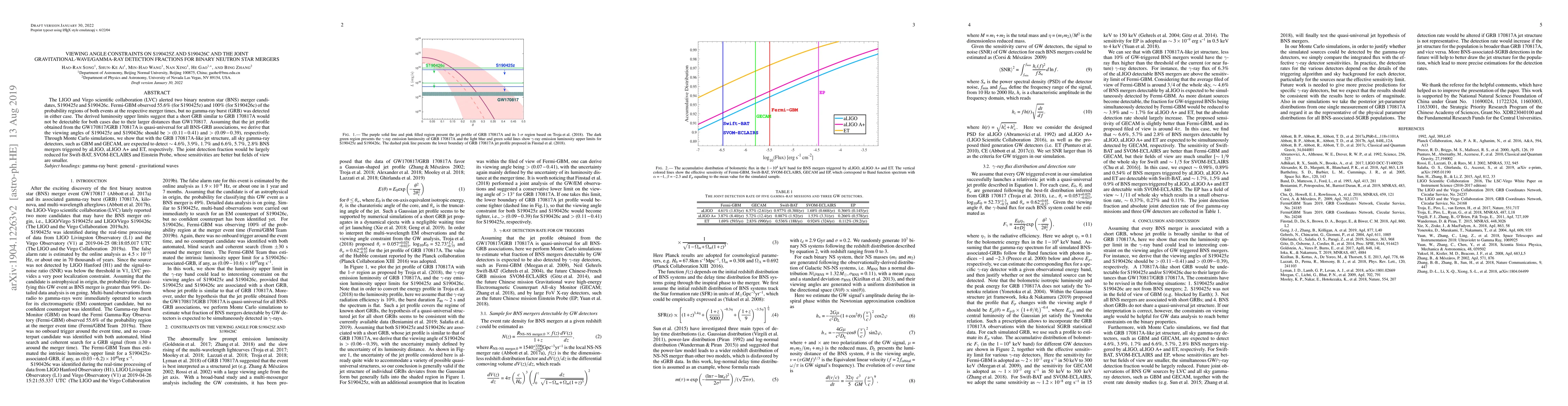 The LIGO and Virgo scientific collaboration (LVC) alerted two binary neutron star (BNS) merger candidates, S190425z and S190426c. Fermi-GBM observed 55.6\% (for S190425z) and 100\% (for S190426c) of the probability regions of both events at the respective merger times, but no gamma-ray burst (GRB) was detected in either case. The derived luminosity upper limits suggest that a short GRB similar to GRB 170817A would not be detectable for both cases due to their larger distances than GW170817. Assuming that the jet profile obtained from the GW170817/GRB 170817A is quasi-universal for all BNS-GRB associations, we derive that the viewing angles of S190425z and S190426c should be $> (0.11-0.41)$ and $> (0.09-0.39)$, respectively. Through Monte Carlo simulations, we show that with the GRB 170817A-like jet structure, all sky gamma-ray detectors, such as GBM and GECAM, are expected to detect $\sim 4.6\%$, $3.9\%$, $1.7\%$ and $6.6\%$, $5.7\%$, $2.8\%$ BNS mergers triggered by aLIGO, aLIGO A+ and ET, respectively. The joint detection fraction would be largely reduced for Swift-BAT, SVOM-ECLAIRS and Einstein Probe, whose sensitivities are better but fields of view are smaller.