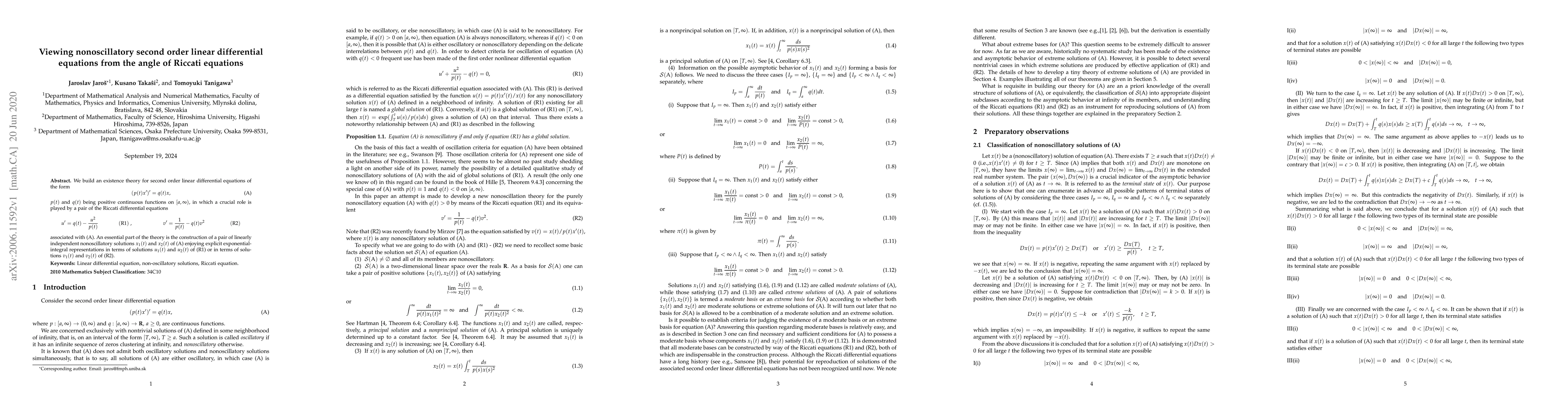 This paper develops an existence theory for nonoscillatory second-order linear differential equations using Riccati equations, establishing explicit exponential-integral representations for solutions in terms of Riccati equation solutions. The focus is on constructing linearly independent nonoscillatory solutions for the given differential equation.