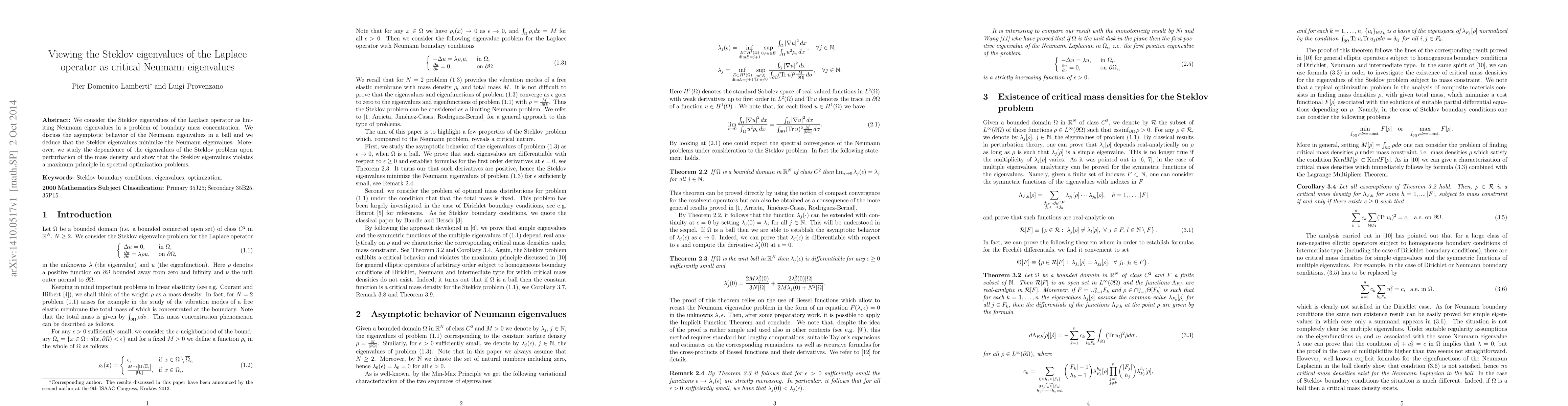 We consider the Steklov eigenvalues of the Laplace operator as limiting Neumann eigenvalues in a problem of boundary mass concentration. We discuss the asymptotic behavior of the Neumann eigenvalues in a ball and we deduce that the Steklov eigenvalues minimize the Neumann eigenvalues. Moreover, we study the dependence of the eigenvalues of the Steklov problem upon perturbation of the mass density and show that the Steklov eigenvalues violates a maximum principle in spectral optimization problems.