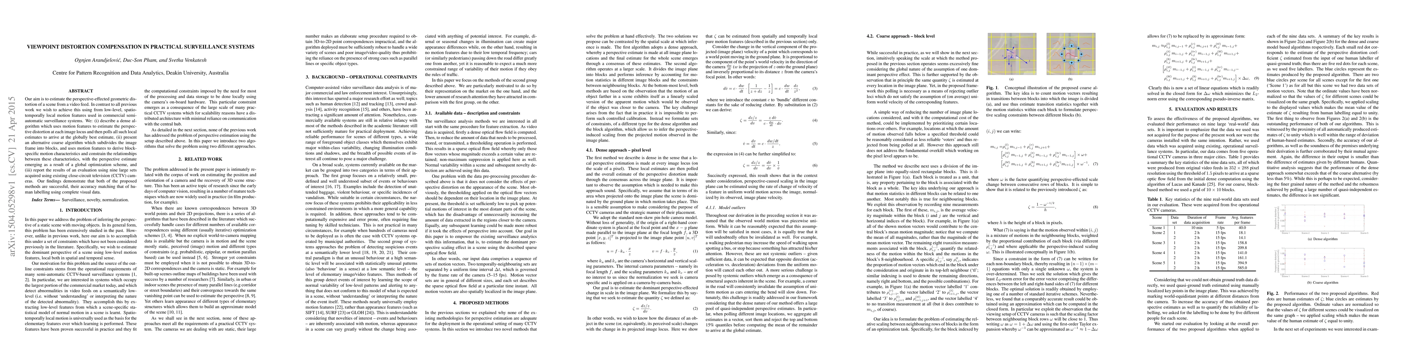 This research introduces methods to estimate perspective distortion in surveillance video feeds using local motion features, outperforming human labelling with complete visual data in accuracy. It details a dense algorithm for comprehensive estimation and a coarse algorithm partitioning the image into blocks for perspective calculation, both validated through extensive CCTV dataset testing.
