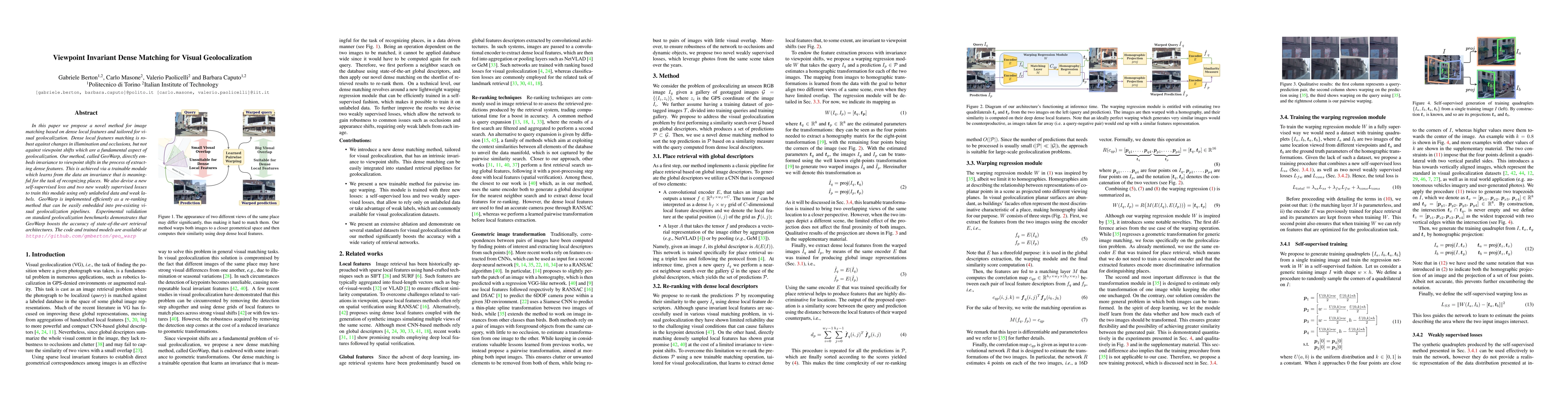 In this paper we propose a novel method for image matching based on dense local features and tailored for visual geolocalization. Dense local features matching is robust against changes in illumination and occlusions, but not against viewpoint shifts which are a fundamental aspect of geolocalization. Our method, called GeoWarp, directly embeds invariance to viewpoint shifts in the process of extracting dense features. This is achieved via a trainable module which learns from the data an invariance that is meaningful for the task of recognizing places. We also devise a new self-supervised loss and two new weakly supervised losses to train this module using only unlabeled data and weak labels. GeoWarp is implemented efficiently as a re-ranking method that can be easily embedded into pre-existing visual geolocalization pipelines. Experimental validation on standard geolocalization benchmarks demonstrates that GeoWarp boosts the accuracy of state-of-the-art retrieval architectures. The code and trained models are available at https://github.com/gmberton/geo_warp