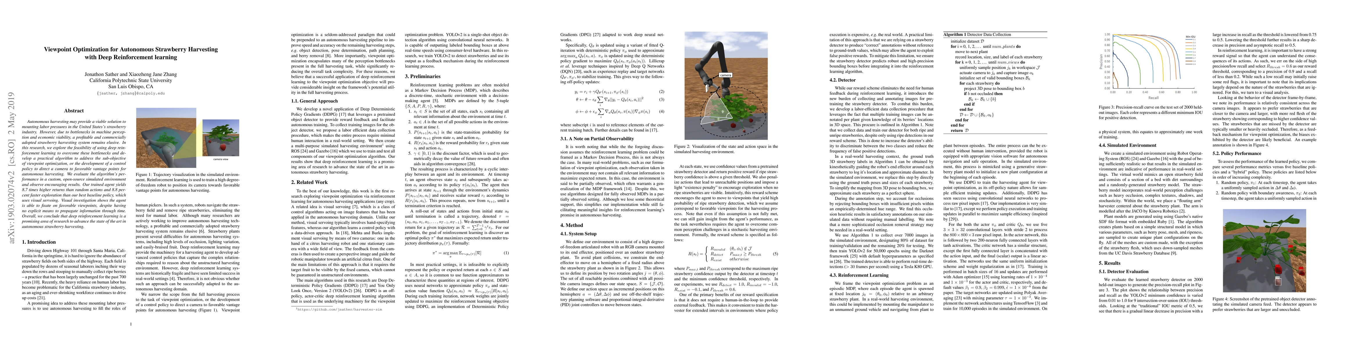 The paper presents a novel application of reinforcement learning to solve the viewpoint optimization problem for autonomous strawberry harvesting, along with a labor-efficient data collection procedure for training a strawberry detector.