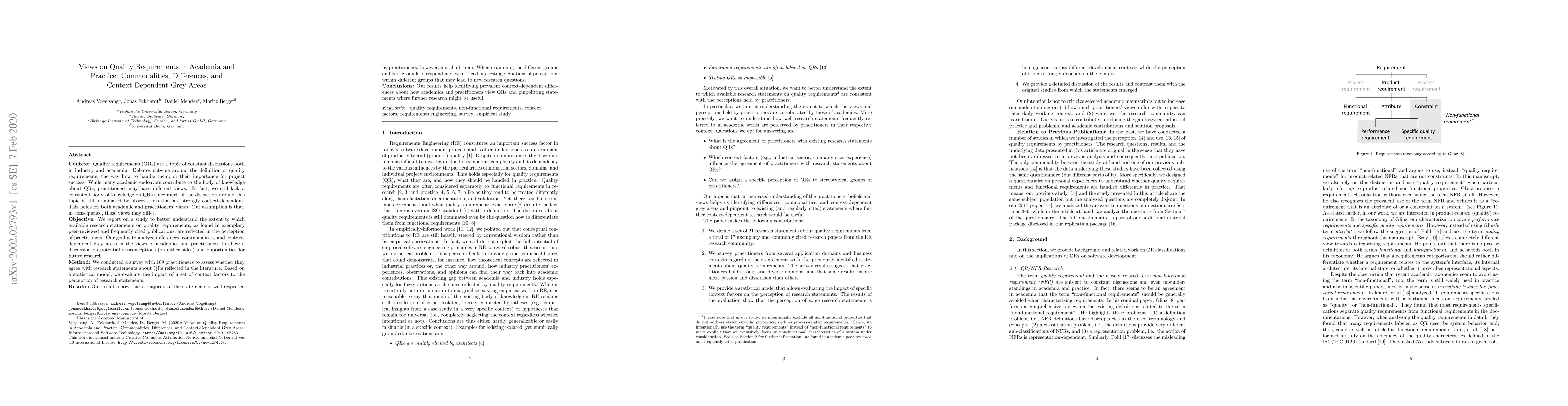 Context: Quality requirements (QRs) are a topic of constant discussions both in industry and academia. Debates entwine around the definition of quality requirements, the way how to handle them, or their importance for project success. While many academic endeavors contribute to the body of knowledge about QRs, practitioners may have different views. In fact, we still lack a consistent body of knowledge on QRs since much of the discussion around this topic is still dominated by observations that are strongly context-dependent. This holds for both academic and practitioners' views. Our assumption is that, in consequence, those views may differ. Objective: We report on a study to better understand the extent to which available research statements on quality requirements, as found in exemplary peer-reviewed and frequently cited publications, are reflected in the perception of practitioners. Our goal is to analyze differences, commonalities, and context-dependent grey areas in the views of academics and practitioners to allow a discussion on potential misconceptions (on either sides) and opportunities for future research. Method: We conducted a survey with 109 practitioners to assess whether they agree with research statements about QRs reflected in the literature. Based on a statistical model, we evaluate the impact of a set of context factors to the perception of research statements. Results: Our results show that a majority of the statements is well respected by practitioners; however, not all of them. When examining the different groups and backgrounds of respondents, we noticed interesting deviations of perceptions within different groups that may lead to new research questions. Conclusions: Our results help identifying prevalent context-dependent differences about how academics and practitioners view QRs and pinpointing statements where further research might be useful.