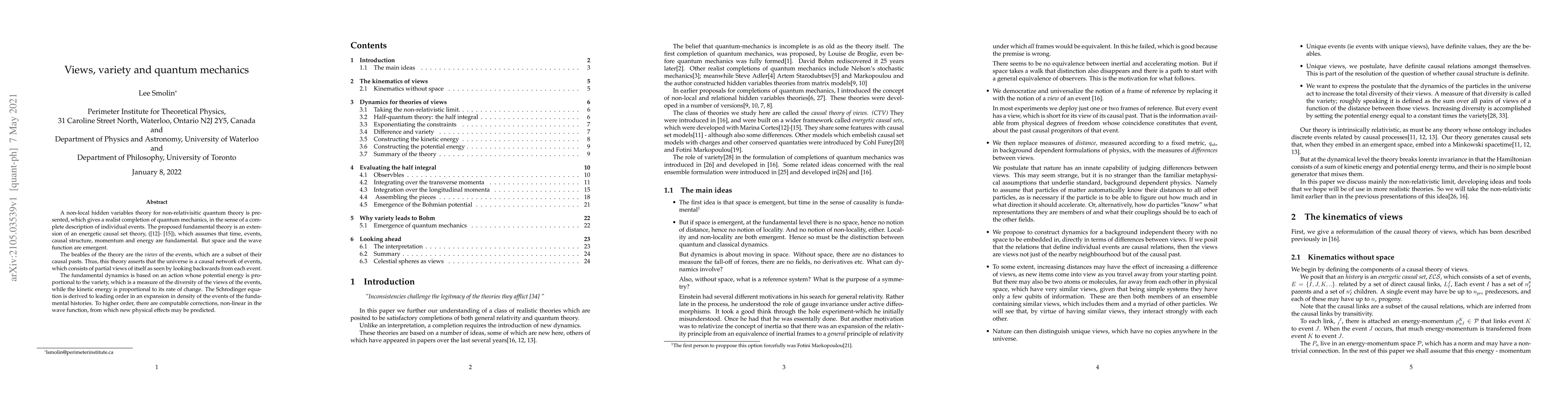 A non-local hidden variables theory for non-relativisitic quantum theory is presented, which gives a realist completion of quantum mechanics, in the sense of a complete description of individual events. The proposed fundamental theory is an extension of an energetic causal set theory, which assumes that time, events, causal structure, momentum and energy are fundamental. But space and the wave function are emergent. The beables of the theory are the views of the events, which are a subset of their causal pasts. Thus, this theory asserts that the universe is a causal network of events, which consists of partial views of itself as seen by looking backwards from each event. The fundamental dynamics is based on an action whose potential energy is proportional to the variety, which is a measure of the diversity of the views of the events, while the kinetic energy is proportional to its rate of change. The Schroedinger equation is derived to leading order in an expansion in density of the events of the fundamental histories. To higher order, there are computable corrections, non-linear in the wave function, from which new physical effects may be predicted.