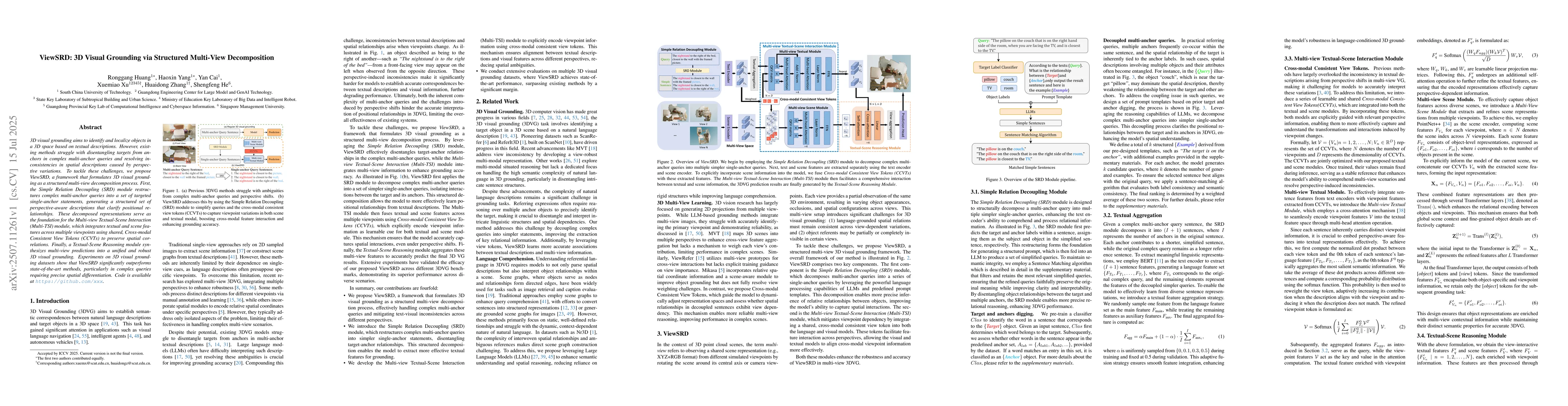 3D visual grounding aims to identify and localize objects in a 3D space based on textual descriptions. However, existing methods struggle with disentangling targets from anchors in complex multi-anchor queries and resolving inconsistencies in spatial descriptions caused by perspective variations. To tackle these challenges, we propose ViewSRD, a framework that formulates 3D visual grounding as a structured multi-view decomposition process. First, the Simple Relation Decoupling (SRD) module restructures complex multi-anchor queries into a set of targeted single-anchor statements, generating a structured set of perspective-aware descriptions that clarify positional relationships. These decomposed representations serve as the foundation for the Multi-view Textual-Scene Interaction (Multi-TSI) module, which integrates textual and scene features across multiple viewpoints using shared, Cross-modal Consistent View Tokens (CCVTs) to preserve spatial correlations. Finally, a Textual-Scene Reasoning module synthesizes multi-view predictions into a unified and robust 3D visual grounding. Experiments on 3D visual grounding datasets show that ViewSRD significantly outperforms state-of-the-art methods, particularly in complex queries requiring precise spatial differentiation.