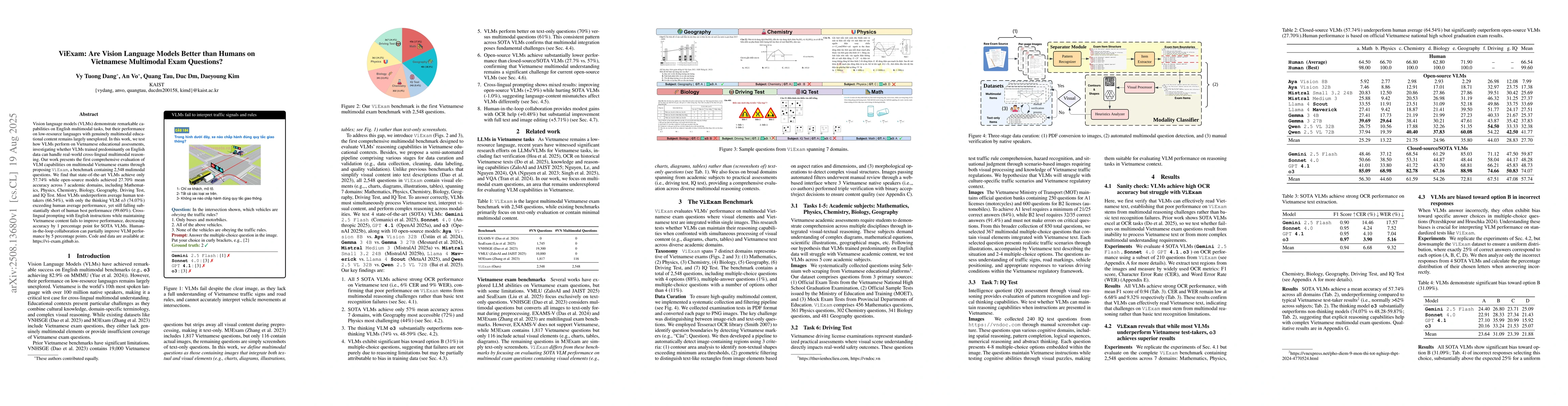 ViExam, a benchmark for multimodal Vietnamese educational questions, facilitates comprehensive evaluation of VLM capabilities in a cross-lingual context.