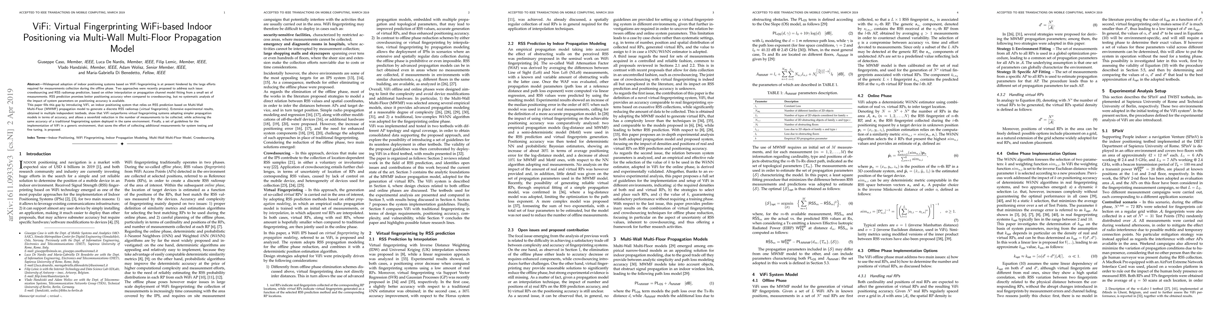 Widespread adoption of indoor positioning systems based on WiFi fingerprinting is at present hindered by the large efforts required for measurements collection during the offline phase. Two approaches were recently proposed to address such issue: crowdsourcing and RSS radiomap prediction, based on either interpolation or propagation channel model fitting from a small set of measurements. RSS prediction promises better positioning accuracy when compared to crowdsourcing, but no systematic analysis of the impact of system parameters on positioning accuracy is available. This paper fills this gap by introducing ViFi, an indoor positioning system that relies on RSS prediction based on Multi-Wall Multi-Floor (MWMF) propagation model to generate a discrete RSS radiomap (virtual fingerprints). Extensive experimental results, obtained in multiple independent testbeds, show that ViFi outperforms virtual fingerprinting systems adopting simpler propagation models in terms of accuracy, and allows a sevenfold reduction in the number of measurements to be collected, while achieving the same accuracy of a traditional fingerprinting system deployed in the same environment. Finally, a set of guidelines for the implementation of ViFi in a generic environment, that saves the effort of collecting additional measurements for system testing and fine tuning, is proposed.