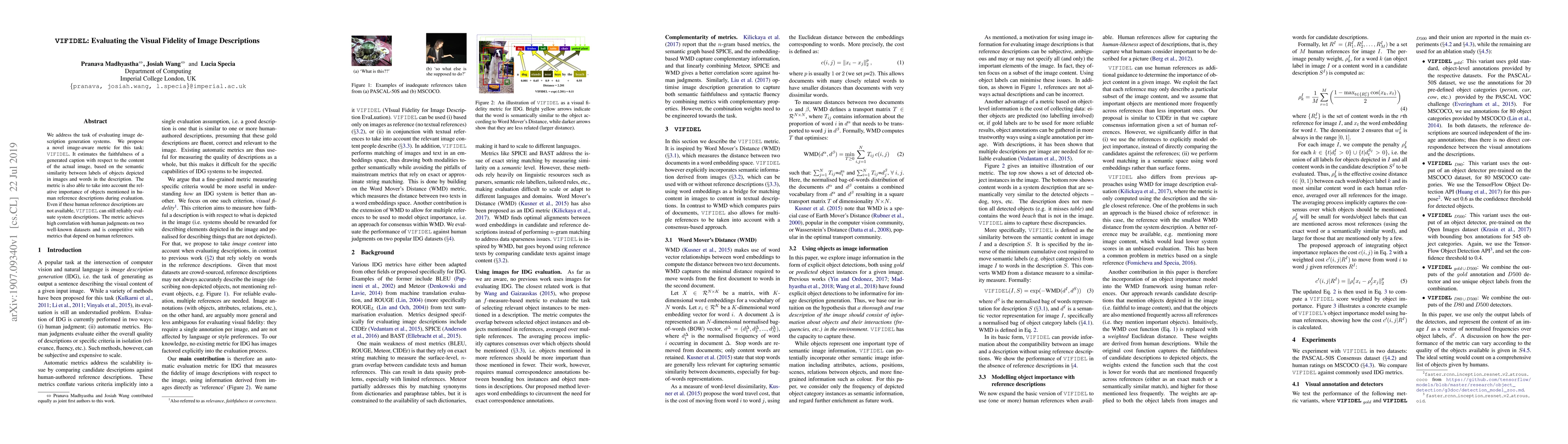 VIFIDEL is a novel metric for evaluating the visual fidelity of image descriptions, estimating caption faithfulness based on semantic similarity between image objects and description words. It can also weigh object importance and correlates well with human judgments on two datasets.