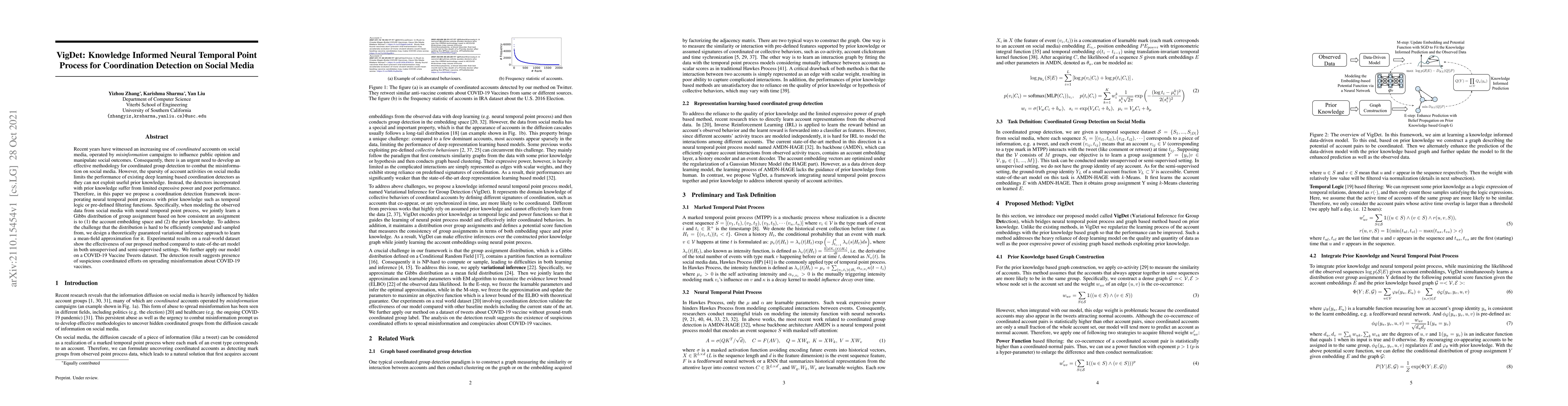 This paper proposes VigDet, a neural temporal point process framework for detecting coordinated accounts on social media, integrating prior knowledge to improve detection accuracy. It uses a variational inference approach to efficiently compute and sample from the learned Gibbs-like distribution, outperforming existing methods in both unsupervised and semi-supervised settings.