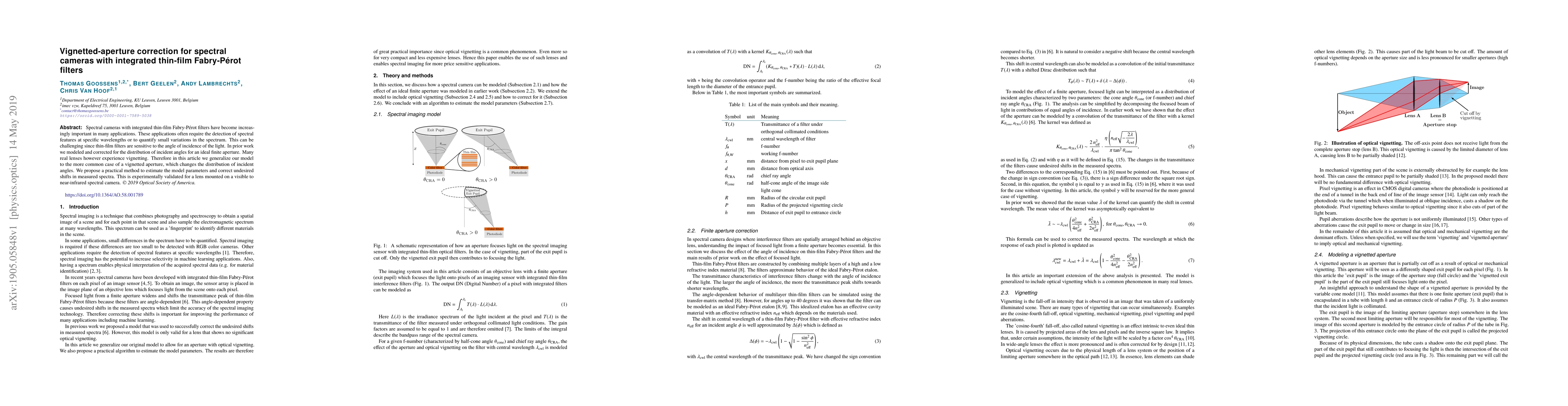 Spectral cameras with integrated thin-film Fabry-P\'erot filters have become increasingly important in many applications. These applications often require the detection of spectral features at specific wavelengths or to quantify small variations in the spectrum. This can be challenging since thin-film filters are sensitive to the angle of incidence of the light. In prior work we modeled and corrected for the distribution of incident angles for an ideal finite aperture. Many real lenses however experience vignetting. Therefore in this article we generalize our model to the more common case of a vignetted aperture, which changes the distribution of incident angles. We propose a practical method to estimate the model parameters and correct undesired shifts in measured spectra. This is experimentally validated for a lens mounted on a visible to near-infrared spectral camera.