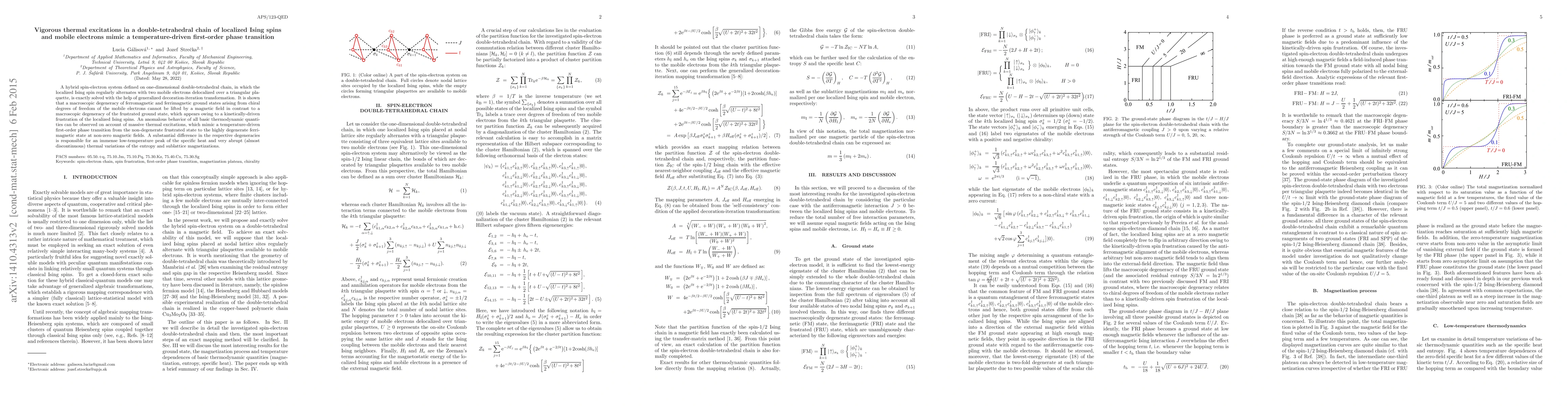 This paper exactly solves a hybrid spin-electron system on a one-dimensional double-tetrahedral chain, revealing that thermal excitations mimic a first-order phase transition due to the substantial difference in ground state degeneracies between the frustrated and ferrimagnetic states. The study highlights the anomalous thermodynamic behavior resulting from kinetically-driven frustration and chiral degrees of freedom.