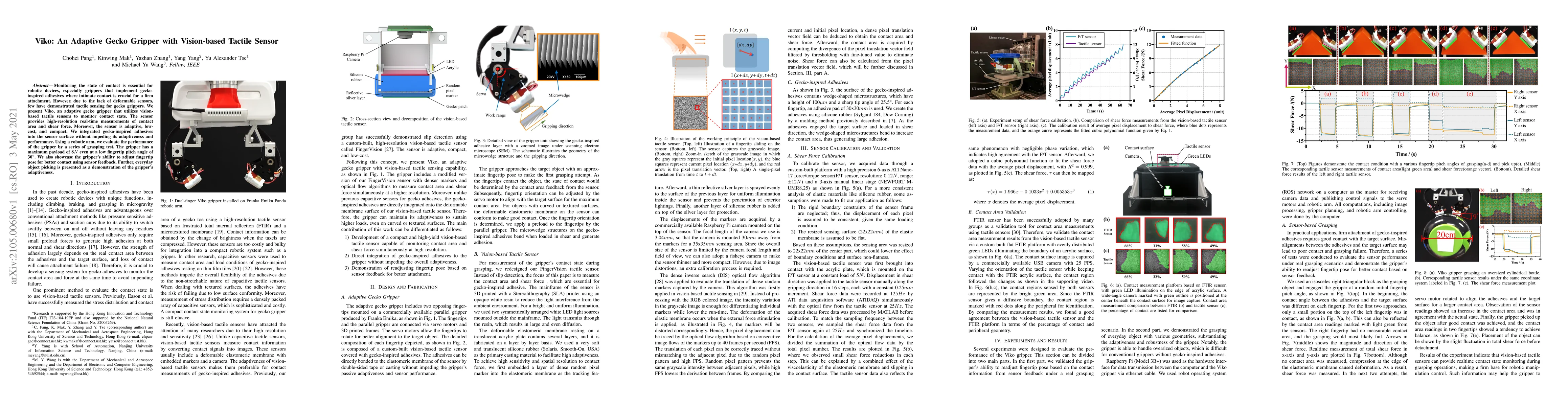 Viko is an adaptive gecko gripper equipped with vision-based tactile sensors to monitor contact state, enabling high-resolution real-time measurements of contact area and shear force. The gripper demonstrates adaptiveness, low-cost, and compact design, successfully grasping objects with a maximum payload of 8N at a 30-degree fingertip pitch angle.