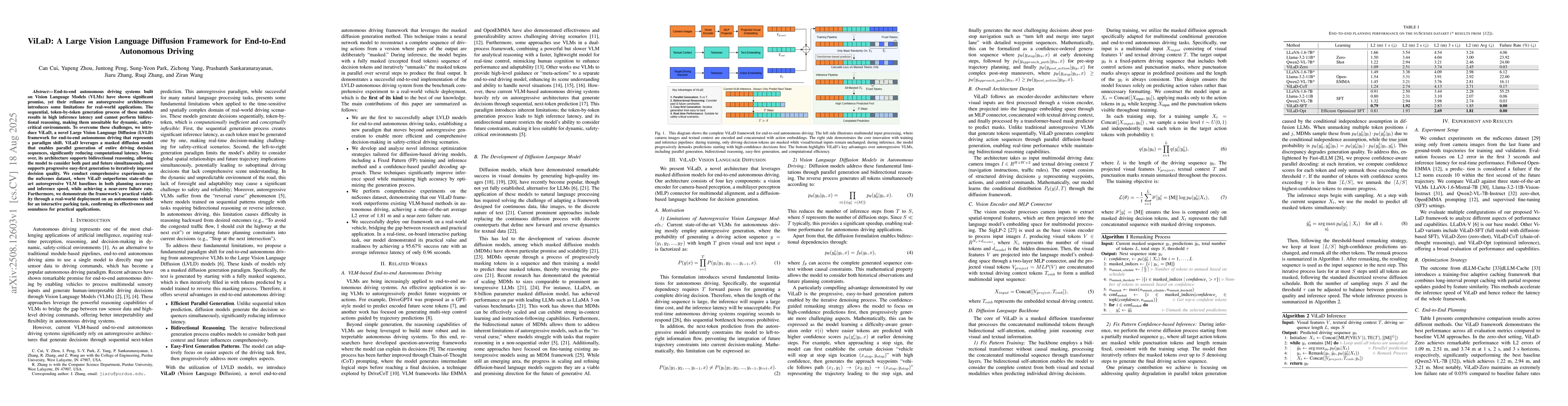 End-to-end autonomous driving systems built on Vision Language Models (VLMs) have shown significant promise, yet their reliance on autoregressive architectures introduces some limitations for real-world applications. The sequential, token-by-token generation process of these models results in high inference latency and cannot perform bidirectional reasoning, making them unsuitable for dynamic, safety-critical environments. To overcome these challenges, we introduce ViLaD, a novel Large Vision Language Diffusion (LVLD) framework for end-to-end autonomous driving that represents a paradigm shift. ViLaD leverages a masked diffusion model that enables parallel generation of entire driving decision sequences, significantly reducing computational latency. Moreover, its architecture supports bidirectional reasoning, allowing the model to consider both past and future simultaneously, and supports progressive easy-first generation to iteratively improve decision quality. We conduct comprehensive experiments on the nuScenes dataset, where ViLaD outperforms state-of-the-art autoregressive VLM baselines in both planning accuracy and inference speed, while achieving a near-zero failure rate. Furthermore, we demonstrate the framework's practical viability through a real-world deployment on an autonomous vehicle for an interactive parking task, confirming its effectiveness and soundness for practical applications.
