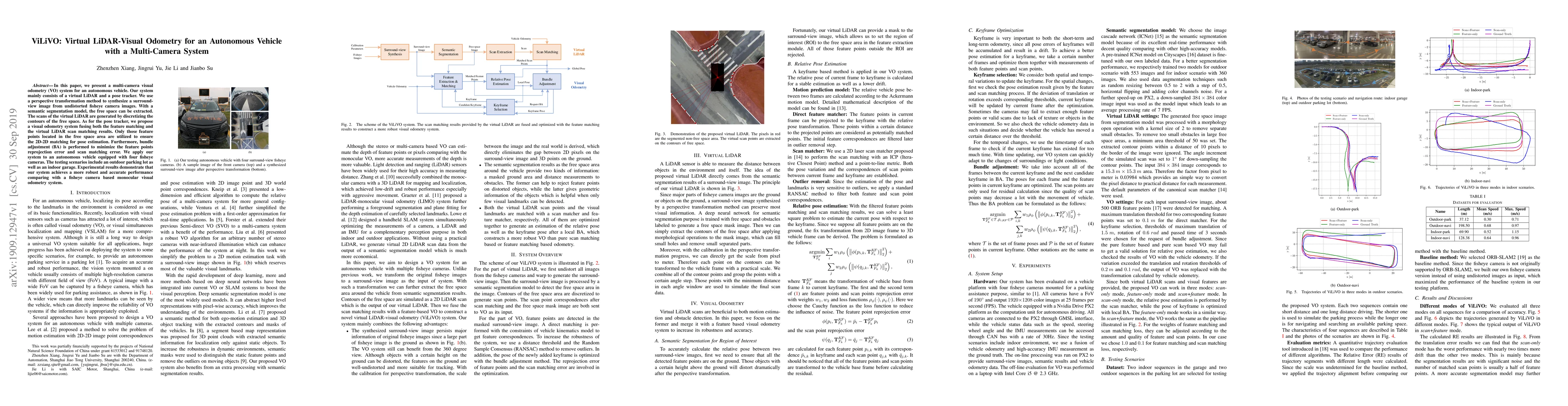 This paper introduces ViLiVO, a multi-camera visual odometry system for autonomous vehicles, combining a virtual LiDAR and pose tracker. It synthesizes surround-view images from fisheye cameras and uses semantic segmentation to extract free space, generating virtual LiDAR scans from contour discretization. The pose tracker fuses feature matching and virtual LiDAR scan matching, ensuring robust and accurate 2D-2D matching, with bundle adjustment for error minimization.