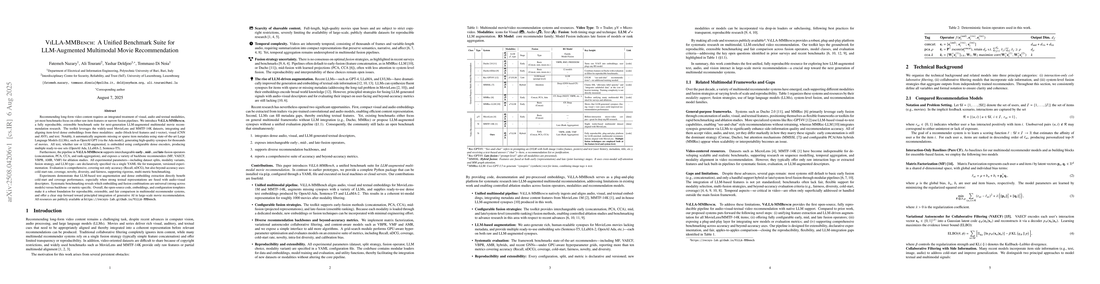 Recommending long-form video content demands joint modeling of visual, audio, and textual modalities, yet most benchmarks address only raw features or narrow fusion. We present ViLLA-MMBench, a reproducible, extensible benchmark for LLM-augmented multimodal movie recommendation. Built on MovieLens and MMTF-14K, it aligns dense item embeddings from three modalities: audio (block-level, i-vector), visual (CNN, AVF), and text. Missing or sparse metadata is automatically enriched using state-of-the-art LLMs (e.g., OpenAI Ada), generating high-quality synopses for thousands of movies. All text (raw or augmented) is embedded with configurable encoders (Ada, LLaMA-2, Sentence-T5), producing multiple ready-to-use sets. The pipeline supports interchangeable early-, mid-, and late-fusion (concatenation, PCA, CCA, rank-aggregation) and multiple backbones (MF, VAECF, VBPR, AMR, VMF) for ablation. Experiments are fully declarative via a single YAML file. Evaluation spans accuracy (Recall, nDCG) and beyond-accuracy metrics: cold-start rate, coverage, novelty, diversity, fairness. Results show LLM-based augmentation and strong text embeddings boost cold-start and coverage, especially when fused with audio-visual features. Systematic benchmarking reveals universal versus backbone- or metric-specific combinations. Open-source code, embeddings, and configs enable reproducible, fair multimodal RS research and advance principled generative AI integration in large-scale recommendation. Code: https://recsys-lab.github.io/ViLLA-MMBench