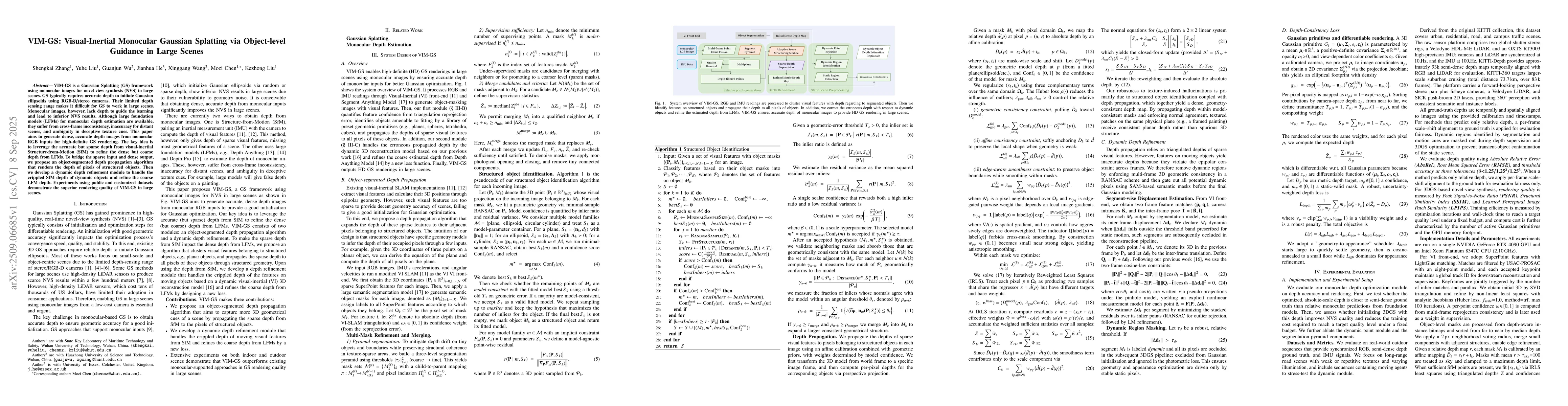 VIM-GS is a Gaussian Splatting (GS) framework using monocular images for novel-view synthesis (NVS) in large scenes. GS typically requires accurate depth to initiate Gaussian ellipsoids using RGB-D/stereo cameras. Their limited depth sensing range makes it difficult for GS to work in large scenes. Monocular images, however, lack depth to guide the learning and lead to inferior NVS results. Although large foundation models (LFMs) for monocular depth estimation are available, they suffer from cross-frame inconsistency, inaccuracy for distant scenes, and ambiguity in deceptive texture cues. This paper aims to generate dense, accurate depth images from monocular RGB inputs for high-definite GS rendering. The key idea is to leverage the accurate but sparse depth from visual-inertial Structure-from-Motion (SfM) to refine the dense but coarse depth from LFMs. To bridge the sparse input and dense output, we propose an object-segmented depth propagation algorithm that renders the depth of pixels of structured objects. Then we develop a dynamic depth refinement module to handle the crippled SfM depth of dynamic objects and refine the coarse LFM depth. Experiments using public and customized datasets demonstrate the superior rendering quality of VIM-GS in large scenes.