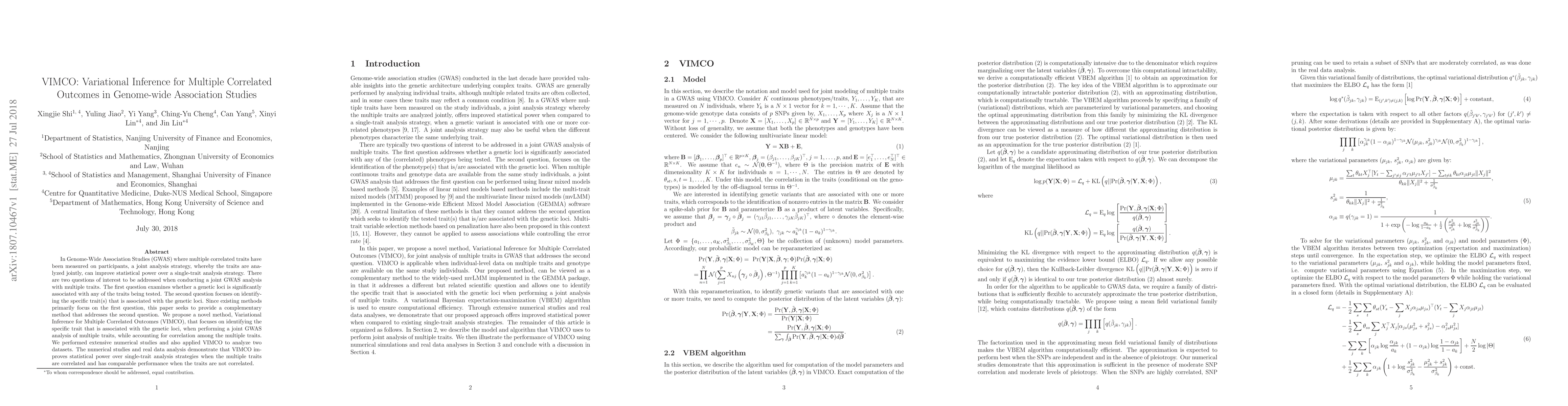 VIMCO is a novel method for joint Genome-Wide Association Studies (GWAS) that identifies specific traits associated with genetic loci, improving statistical power when traits are correlated. It outperforms single-trait analysis strategies in correlated trait scenarios, as demonstrated through numerical studies and real data analysis.