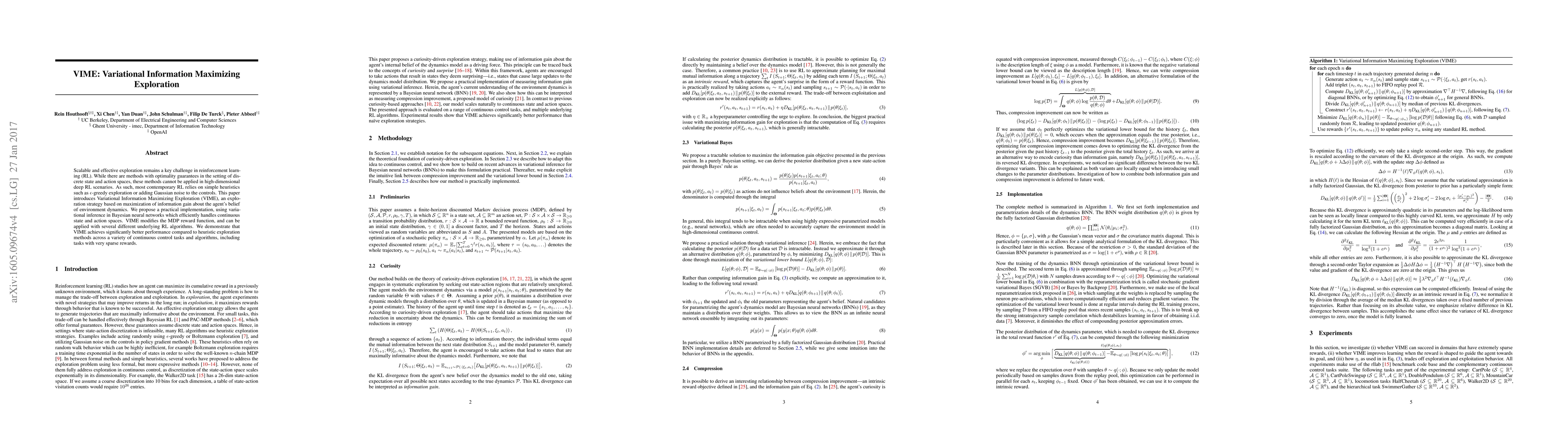 Scalable and effective exploration remains a key challenge in reinforcement learning (RL). While there are methods with optimality guarantees in the setting of discrete state and action spaces, these methods cannot be applied in high-dimensional deep RL scenarios. As such, most contemporary RL relies on simple heuristics such as epsilon-greedy exploration or adding Gaussian noise to the controls. This paper introduces Variational Information Maximizing Exploration (VIME), an exploration strategy based on maximization of information gain about the agent's belief of environment dynamics. We propose a practical implementation, using variational inference in Bayesian neural networks which efficiently handles continuous state and action spaces. VIME modifies the MDP reward function, and can be applied with several different underlying RL algorithms. We demonstrate that VIME achieves significantly better performance compared to heuristic exploration methods across a variety of continuous control tasks and algorithms, including tasks with very sparse rewards.