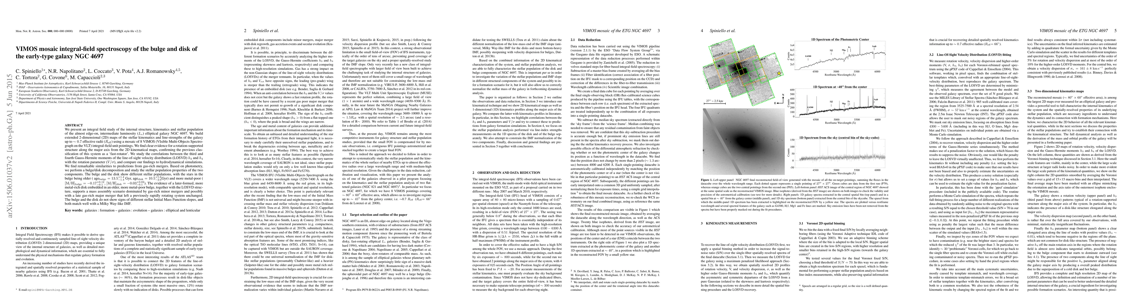 We present an integral field study of the internal structure, kinematics and stellar population of the almost edge-on, intermediate luminosity ($L_ {*}$) elliptical galaxy NGC 4697. We build extended 2-dimensional (2D) maps of the stellar kinematics and line-strengths of the galaxy up to $\sim 0.7 $ effective radii (R$_{eff}$) using a mosaic of 8 VIMOS (VIsible Multi-Objects Spectrograph on the VLT) integral-field unit pointings. We find clear evidence for a rotation-supported structure along the major axis from the 2D kinematical maps, confirming the previous classification of this system as a `fast-rotator'. We study the correlations between the third and fourth Gauss-Hermite moments of the line-of-sight velocity distribution (LOSVD) $h_3$ and $h_4$ with the rotation parameter ($V/\sigma$), and compare our findings to hydrodynamical simulations. We find remarkable similarities to predictions from gas-rich mergers. Based on photometry, we perform a bulge/disk decomposition and study the stellar population properties of the two components. The bulge and the disk show different stellar populations, with the stars in the bulge being older (age$_{\rm bulge}=13.5^{+1.4}_{-1.4}$ Gyr, age$_{\rm disk}=10.5^{+1.6}_{-2.0}$Gyr) and more metal-poor ($\mathrm{[M/H]_{bulge}} = -0.17^{+0.12}_{-0.1}$, $\mathrm{[M/H]_{disk}}=-0.03^{+0.02}_{-0.1}$). The evidence of a later-formed, more metal-rich disk embedded in an older, more metal-poor bulge, together with the LOSVD structure, supports a mass assembly scenario dominated by gas-rich minor mergers and possibly with a late gas-rich major merger that left a previously rapidly rotating system unchanged. The bulge and the disk do not show signs of different stellar Initial Mass Function slopes, and both match well with a Milky Way-like IMF.