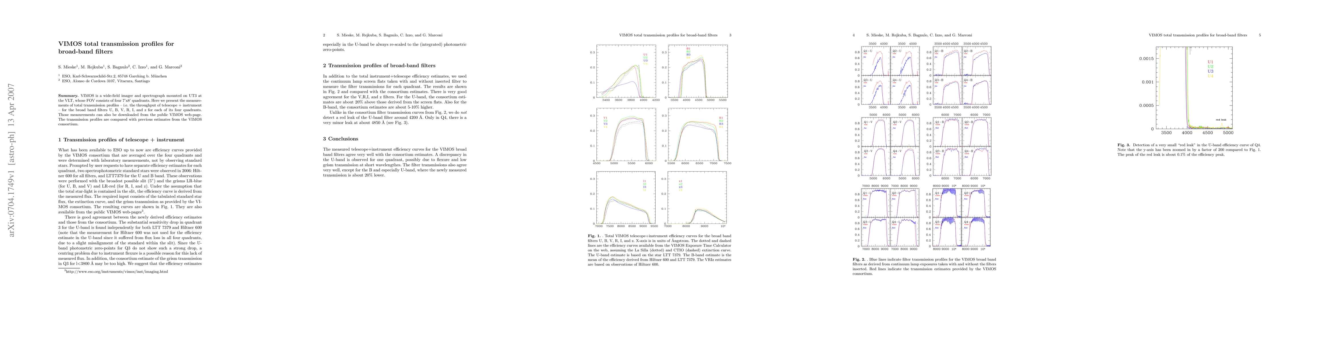 VIMOS is a wide-field imager and spectrograph mounted on UT3 at the VLT, whose FOV consists of four 7'x8' quadrants. Here we present the measurements of total transmission profiles -- i.e. the throughput of telescope + instrument -- for the broad band filters U, B, V, R, I, and z for each of its four quadrants. Those measurements can also be downloaded from the public VIMOS web-page. The transmission profiles are compared with previous estimates from the VIMOS consortium.