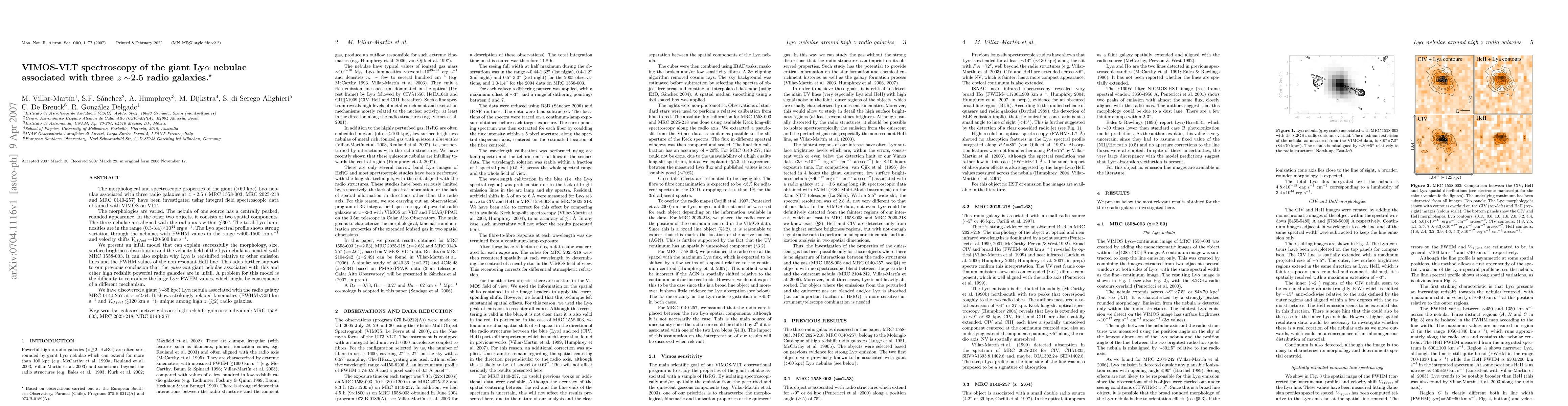 The morphological and spectroscopic properties of the giant (>60 kpc) Ly-alpha nebulae associated with three radio galaxies at z~2.5 (MRC 1558-003, MRC 2025-218 and MRC 0140-257) have been investigated using integral field spectroscopic data obtained with VIMOS on VLT. The morphologies are varied. The nebula of one source has a centrally peaked, rounded appearance. In the other two objects, it consists of two spatial components. The three nebulae are aligned with the radio axis within <30 deg. The total Ly-alpha luminosities are in the range (0.3-3.4) x 1e44 erg s-1. The Ly-alpha spectral profile shows strong variation through the nebulae, with FWHM values in the range ~400-1500 km s-1 and velocity shifts V~120-600 km s-1. We present an infall model which can explain successfully most Ly-alpha morphological and spectroscopic properties of the nebula associated with MRC 1558-003. This adds further support to our previous conclusion that the _quiescent_ giant nebulae associated with this and other high redshift powerful radio galaxies are in infall. A problem for this model is the difficulty to reproduce the large Ly-alpha FWHM values. We have discovered a giant (~85 kpc) Ly-alpha nebula associated with the radio galaxy MRC 0140-257 at z=2.64. It shows strikingly relaxed kinematics (FWHM< 300 km s-1 and V<120 km s-1), unique among high z (>2) radio galaxies.