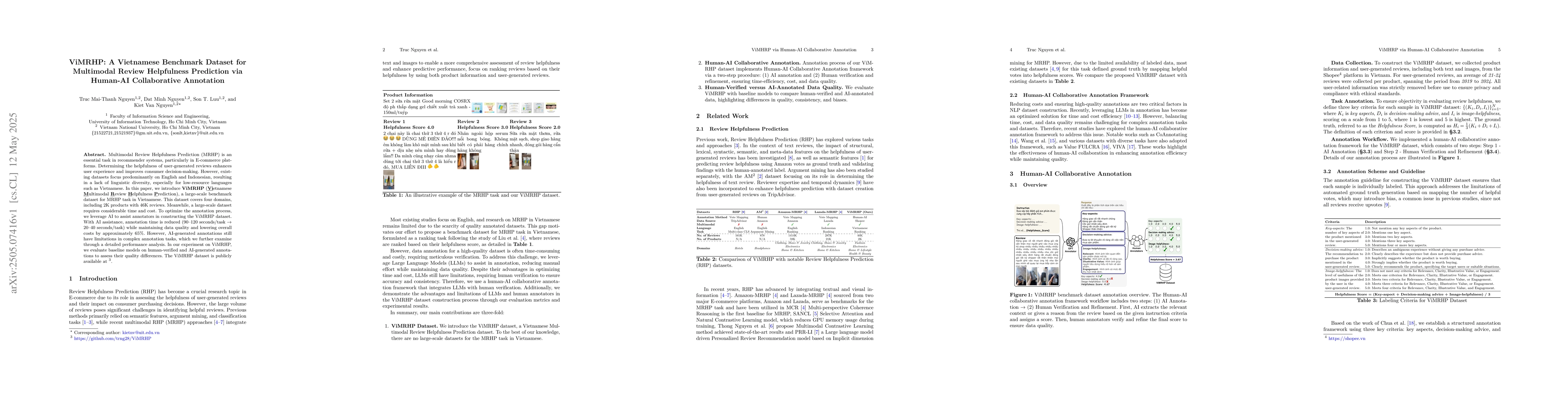 The research introduces ViMRHP, a Vietnamese benchmark dataset for Multimodal Review Helpfulness Prediction (MRHP) task, created using human-AI collaborative annotation to optimize the annotation process and reduce costs by approximately 65%.