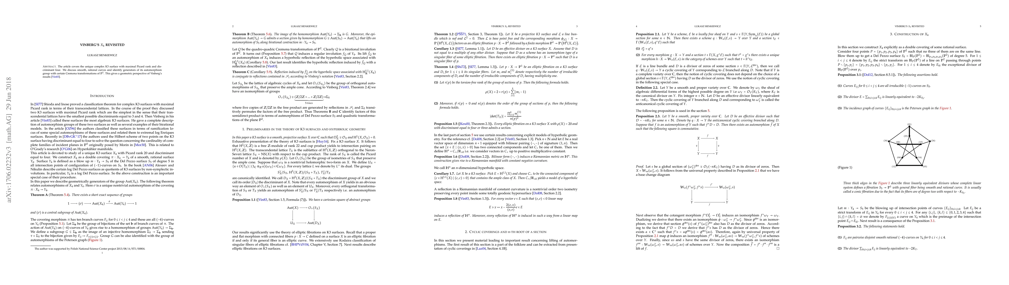 The article covers the unique complex K3 surface with maximal Picard rank and discriminant four. We discuss smooth, rational curves and identify generators of its automorphism group with certain Cremona transformations of $\mathbb{P}^2$. This gives a geometric perspective of Vinberg's results.