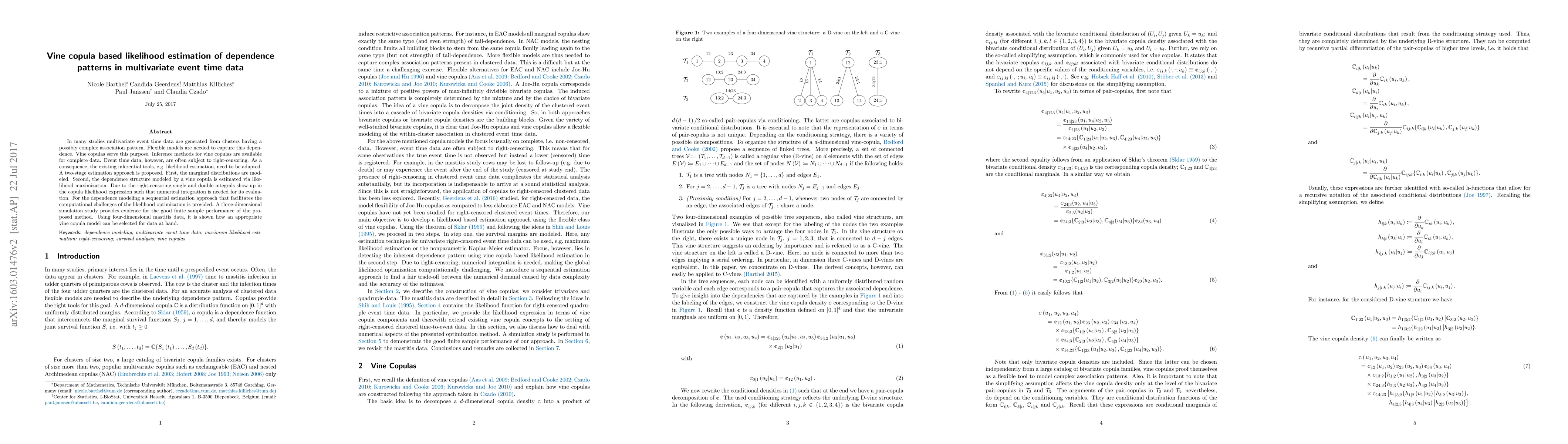 In many studies multivariate event time data are generated from clusters having a possibly complex association pattern. Flexible models are needed to capture this dependence. Vine copulas serve this purpose. Inference methods for vine copulas are available for complete data. Event time data, however, are often subject to right-censoring. As a consequence, the existing inferential tools, e.g. likelihood estimation, need to be adapted. A two-stage estimation approach is proposed. First, the marginal distributions are modeled. Second, the dependence structure modeled by a vine copula is estimated via likelihood maximization. Due to the right-censoring single and double integrals show up in the copula likelihood expression such that numerical integration is needed for its evaluation. For the dependence modeling a sequential estimation approach that facilitates the computational challenges of the likelihood optimization is provided. A three-dimensional simulation study provides evidence for the good finite sample performance of the proposed method. Using four-dimensional mastitis data, it is shown how an appropriate vine copula model can be selected for data at hand.
