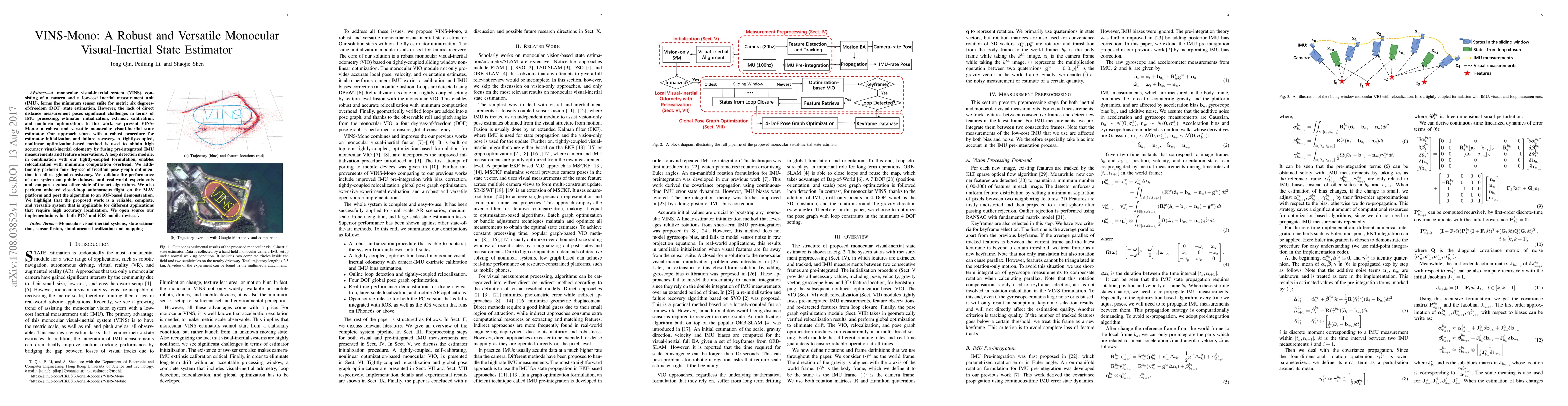 A monocular visual-inertial system (VINS), consisting of a camera and a low-cost inertial measurement unit (IMU), forms the minimum sensor suite for metric six degrees-of-freedom (DOF) state estimation. However, the lack of direct distance measurement poses significant challenges in terms of IMU processing, estimator initialization, extrinsic calibration, and nonlinear optimization. In this work, we present VINS-Mono: a robust and versatile monocular visual-inertial state estimator.Our approach starts with a robust procedure for estimator initialization and failure recovery. A tightly-coupled, nonlinear optimization-based method is used to obtain high accuracy visual-inertial odometry by fusing pre-integrated IMU measurements and feature observations. A loop detection module, in combination with our tightly-coupled formulation, enables relocalization with minimum computation overhead.We additionally perform four degrees-of-freedom pose graph optimization to enforce global consistency. We validate the performance of our system on public datasets and real-world experiments and compare against other state-of-the-art algorithms. We also perform onboard closed-loop autonomous flight on the MAV platform and port the algorithm to an iOS-based demonstration. We highlight that the proposed work is a reliable, complete, and versatile system that is applicable for different applications that require high accuracy localization. We open source our implementations for both PCs and iOS mobile devices.