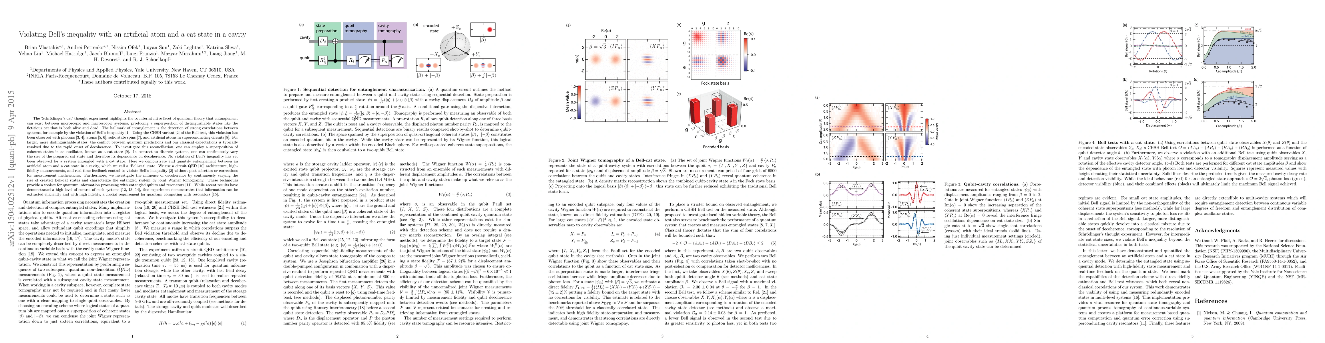 This paper demonstrates the violation of Bell's inequality using a circuit QED architecture with an artificial atom and a cat state in a cavity, termed a 'Bell-cat' state. The experiment shows strong correlations without decoherence corrections, highlighting the potential for quantum computing with resonators.