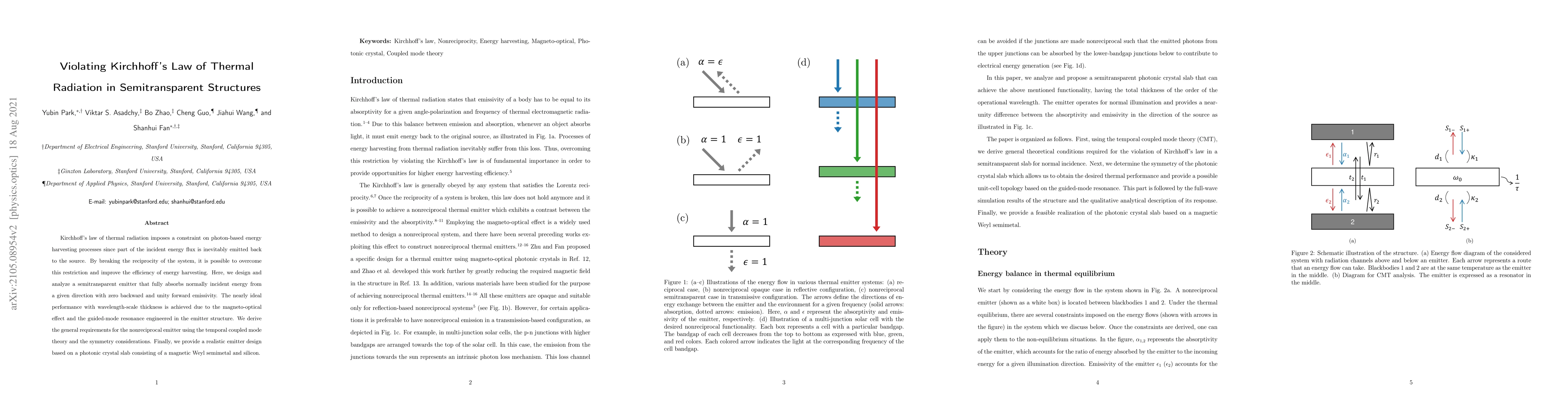 This paper explores the design and analysis of a semitransparent emitter that violates Kirchhoff's law of thermal radiation, achieving zero backward and unity forward emissivity. The authors utilize magneto-optical effects and guided-mode resonance to enhance energy harvesting efficiency.