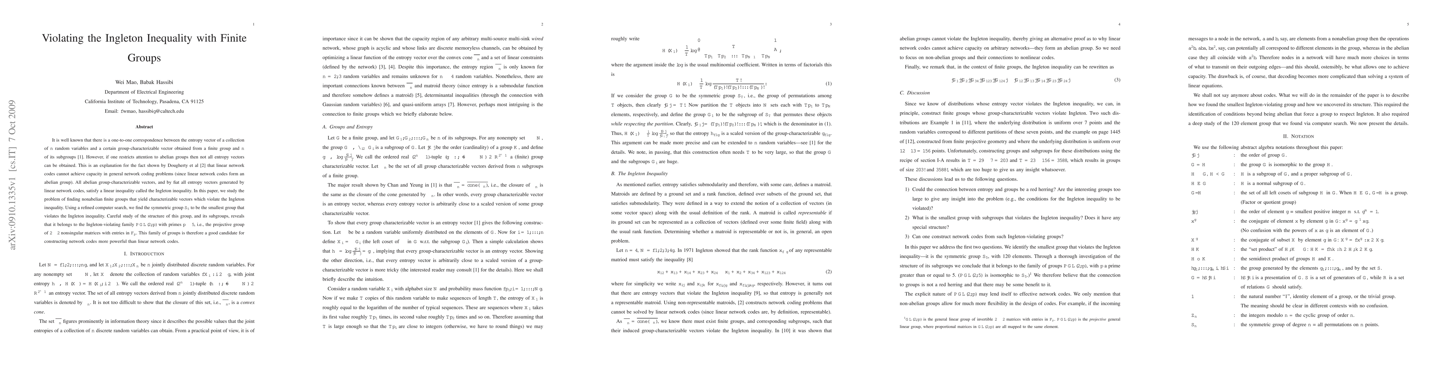 This paper explores how nonabelian finite groups can yield characterizable vectors that violate the Ingleton inequality, which is a constraint for entropy vectors from abelian groups. The symmetric group S_5 is identified as the smallest group that violates this inequality, belonging to the PGL(2,p) family, indicating potential for constructing more powerful network codes beyond linear network codes.