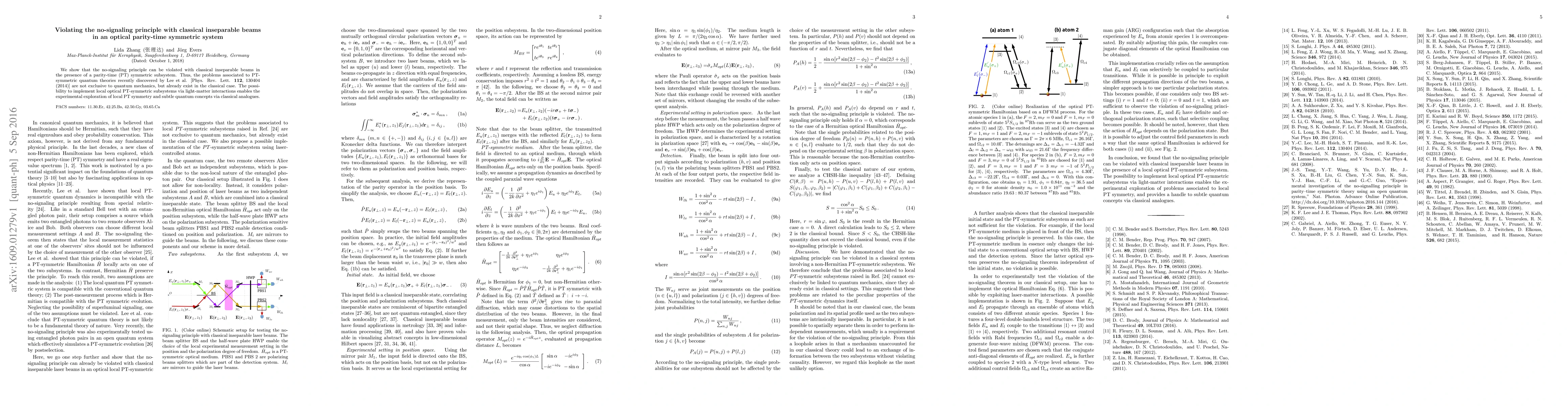 This paper demonstrates that classical inseparable beams can violate the no-signaling principle in an optical parity-time symmetric system, indicating that issues related to PT-symmetric quantum theories extend to classical systems. This finding opens avenues for experimental exploration of local PT symmetry and quantum concepts using classical analogues.