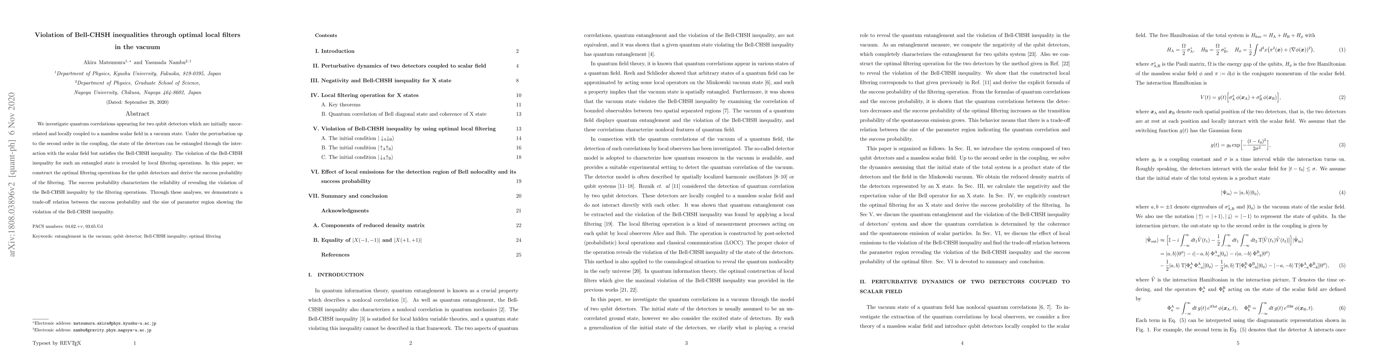 This paper explores quantum correlations in two initially uncorrelated qubit detectors locally coupled to a vacuum scalar field, demonstrating that entanglement induced by scalar field interaction satisfies the Bell-CHSH inequality. Optimal local filtering operations reveal a violation of the Bell-CHSH inequality, and the study finds a trade-off between the success probability of these operations and the parameter region where the inequality is violated.