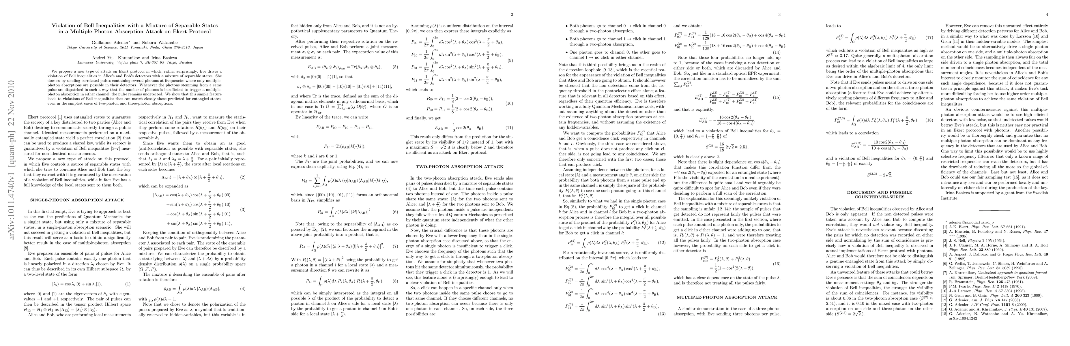 We propose a new type of attack on Ekert protocol in which, rather surprisingly, Eve drives a violation of Bell inequalities in Alice's and Bob's detectors with a mixture of separable states. She does so by sending correlated pulses containing several photons at frequencies where only multiple-photon absorptions are possible in their detectors. Whenever the photons stemming from a same pulse are dispatched in such a way that the number of photons is insufficient to trigger a multiple-photon absorption in either channel, the pulse remains undetected. We show that this simple feature leads to violations of Bell inequalities that can match closely those predicted for entangled states, even in the simplest cases of two-photon and three-photon absorptions.