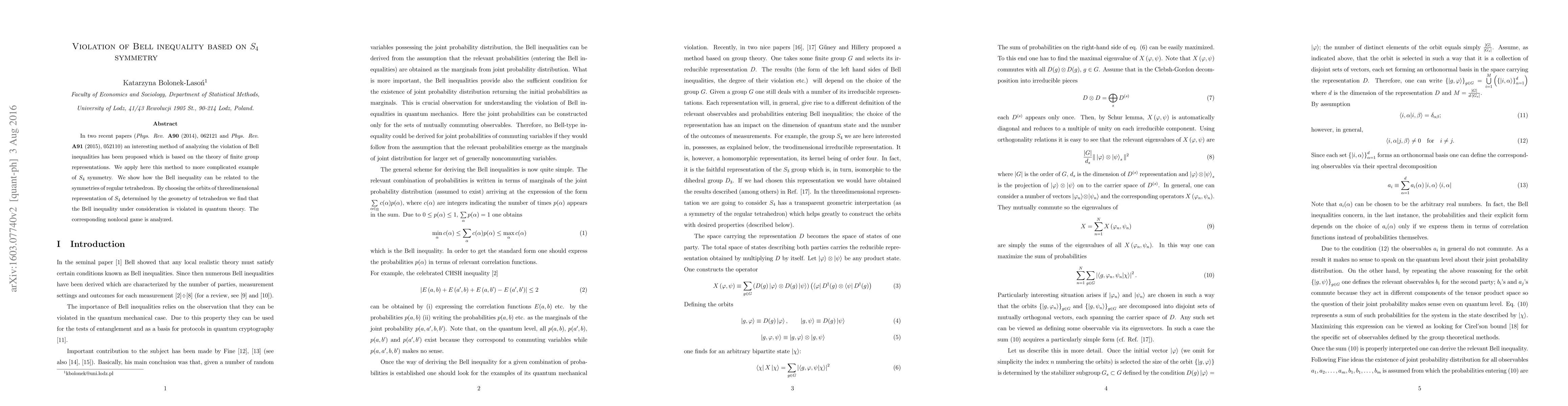 In two recent papers (Phys. Rev. A90 (2014), 062121 and Phys. Rev. A91 (2015), 052110) an interesting method of analyzing the violation of Bell inequalities has been proposed which is based on the theory of finite group representations. We apply here this method to more complicated example of $S_4$ symmetry. We show how the Bell inequality can be related to the symmetries of regular tetrahedron. By choosing the orbits of threedimensional representation of $S_4$ determined by the geometry of tetrahedron we find that the Bell inequality under consideration is violated in quantum theory. The corresponding nonlocal game is analyzed.