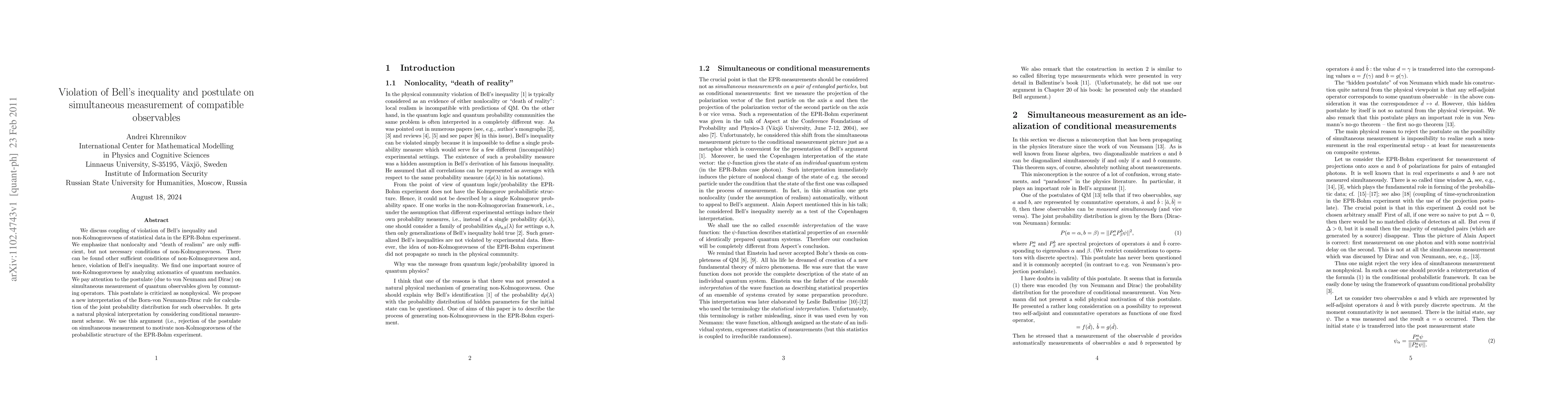 This paper explores the connection between the violation of Bell's inequality and non-Kolmogorovian statistical data in the EPR-Bohm experiment, arguing that nonlocality is not a necessary condition for non-Kolmogorovness. The authors critique the von Neumann-Dirac postulate on simultaneous measurement of compatible observables, proposing a new interpretation based on conditional measurement schemes to explain the non-Kolmogorovian probabilistic structure.