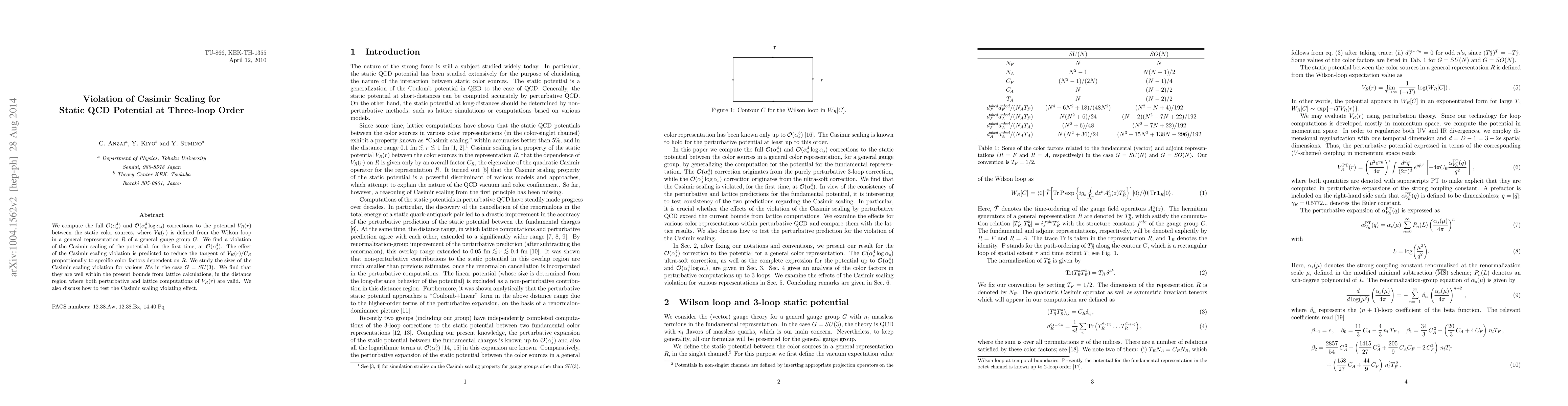 We compute the full ${\cal O}(\alpha_s^4)$ and ${\cal O}(\alpha_s^4\log\alpha_s)$ corrections to the potential $V_R(r)$ between the static color sources, where $V_R(r)$ is defined from the Wilson loop in a general representation $R$ of a general gauge group $G$. We find a violation of the Casimir scaling of the potential, for the first time, at ${\cal O}(\alpha_s^4)$. The effect of the Casimir scaling violation is predicted to reduce the tangent of $V_R(r)/C_R$ proportionally to specific color factors dependent on $R$. We study the sizes of the Casimir scaling violation for various $R$'s in the case $G=SU(3)$. We find that they are well within the present bounds from lattice calculations, in the distance region where both perturbative and lattice computations of $V_R(r)$ are valid. We also discuss how to test the Casimir scaling violating effect.
