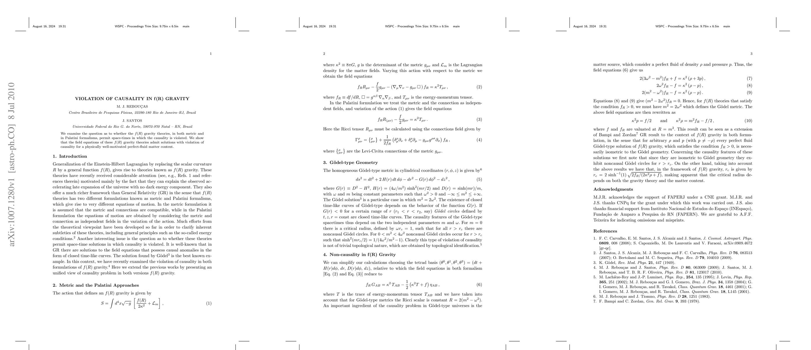 This paper investigates whether f(R) gravity theories, in both metric and Palatini formulations, allow for spacetimes where causality is violated. It demonstrates that these theories can admit solutions that violate causality under a well-motivated perfect-fluid matter content.