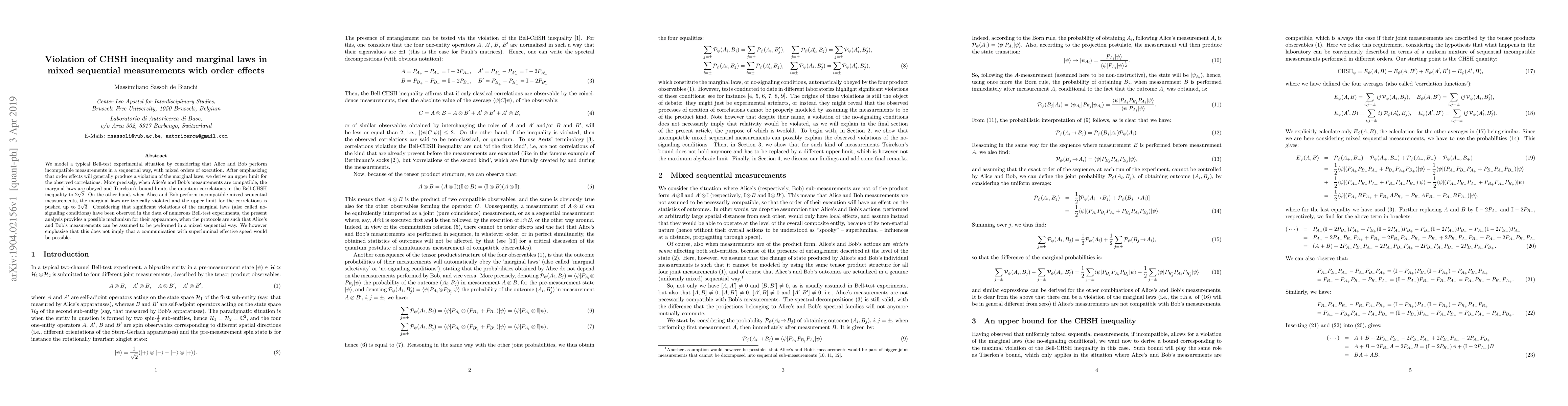 This paper examines mixed sequential measurements where Alice and Bob perform incompatible measurements, showing that such order effects typically violate marginal laws and can push the upper limit of correlations to $2\sqrt{3}$, providing a mechanism for observed significant violations in Bell-test experiments without implying superluminal communication.