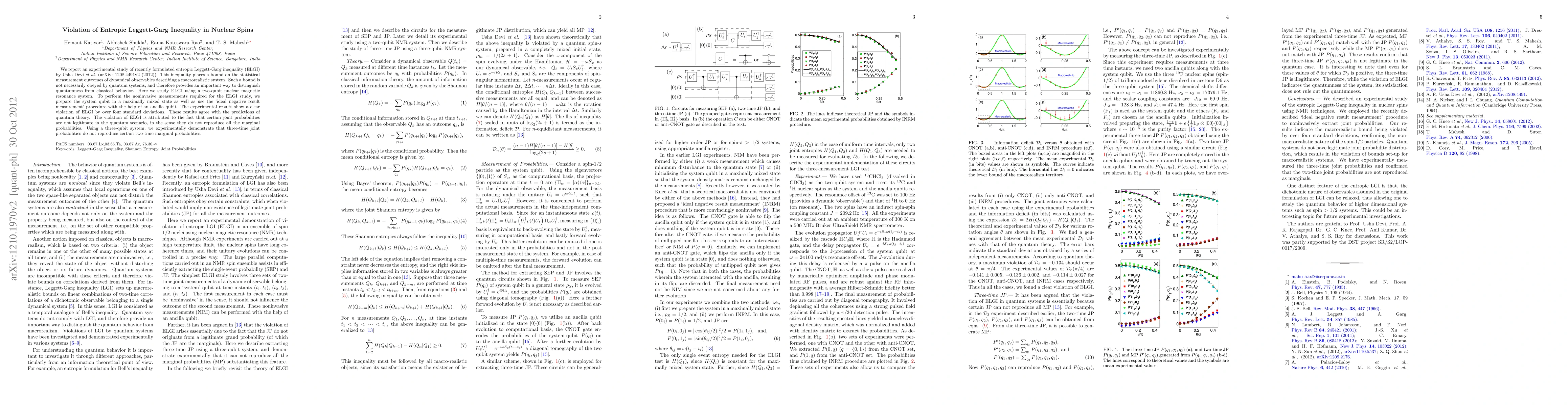 This study experimentally violates the entropic Leggett-Garg inequality (ELGI) in a two-qubit nuclear magnetic resonance system, demonstrating quantum behavior distinct from classical systems. The results support quantum theory predictions and highlight the non-reproducibility of certain joint probabilities in quantum scenarios.