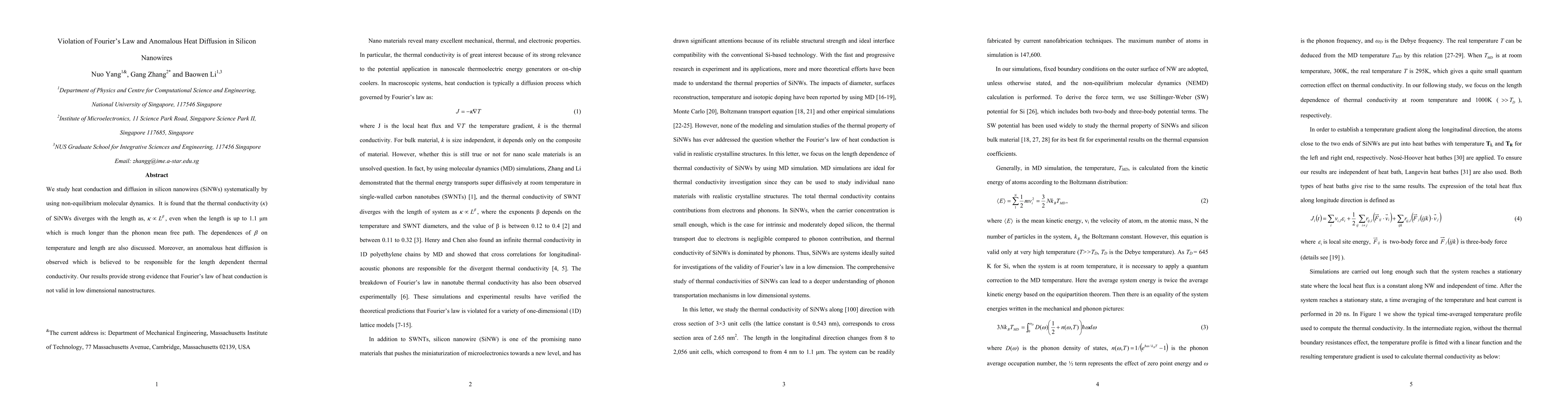 This study reveals that silicon nanowires exhibit diverging thermal conductivity with length, contradicting Fourier's law, and demonstrates anomalous heat diffusion, suggesting non-traditional heat conduction mechanisms in low-dimensional nanostructures.