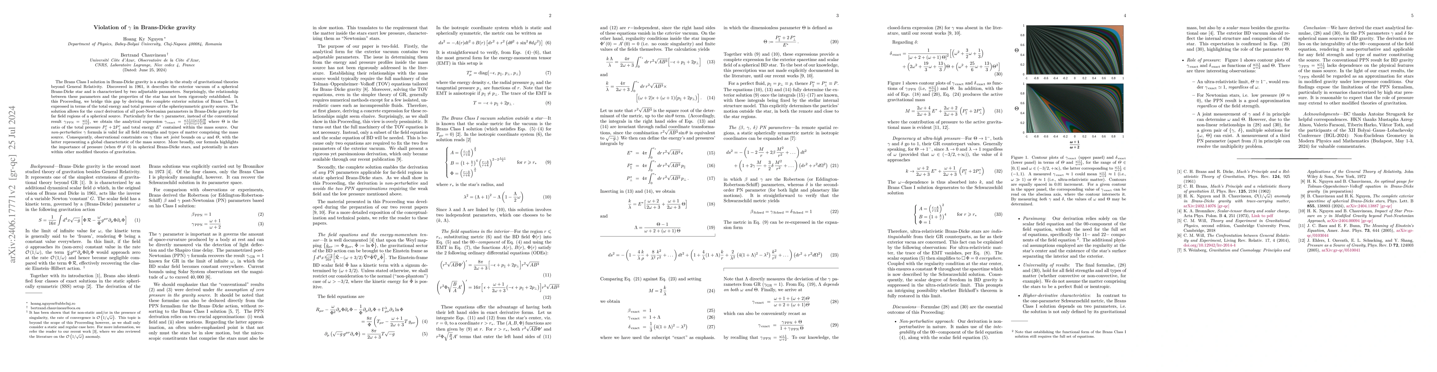 The Brans Class I solution in Brans-Dicke gravity is a staple in the study of gravitational theories beyond General Relativity. Discovered in 1961, it describes the exterior vacuum of a spherical Brans-Dicke star and is characterized by two adjustable parameters. Surprisingly, the relationship between these parameters and the properties of the star has not been rigorously established. In this Proceeding, we bridge this gap by deriving $\textit{the}$ complete exterior solution of Brans Class I, expressed in terms of the total energy and total pressure of the spherisymmetric gravity source. The solution allows for the $\textit{exact}$ derivation of $\textit{all}$ post-Newtonian parameters in Brans-Dicke gravity for far field regions of a spherical source. Particularly for the $\gamma$ parameter, instead of the conventional result $\gamma_{\,\text{PPN}}=\frac{\omega+1}{\omega+2}$, we obtain the analytical expression $\gamma_{\,\text{exact}}=\frac{\omega+1+(\omega+2)\,\Theta}{\omega+2+(\omega+1)\,\Theta}$ where $\Theta$ is the ratio of the total pressure $P_{\parallel}^{*}+2P_{\perp}^{*}$ and total energy $E^{*}$ contained within the mass source. Our $\textit{non-perturbative}$ $\gamma$ formula is valid for all field strengths and types of matter comprising the mass source. Consequently, observational constraints on $\gamma$ thus set $\textit{joint}$ bounds on $\omega$ and $\varTheta$, with the latter representing a global characteristic of the mass source. More broadly, our formula highlights the importance of pressure (when $\varTheta\neq0$) in spherical Brans-Dicke stars, and potentially in stars within other modified theories of gravitation.